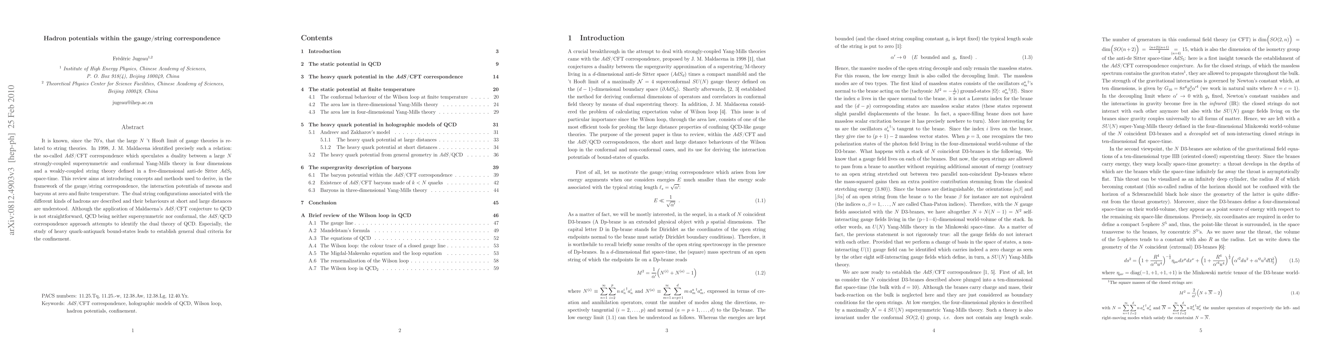 This paper reviews the derivation of hadron interaction potentials within the gauge/string correspondence, specifically using the AdS/CFT duality to understand mesons and baryons' potentials at various temperatures. It explores dual string configurations and discusses the AdS/QCD approach to extend the correspondence to QCD, focusing on confinement criteria for heavy quark-antiquark bound-states.