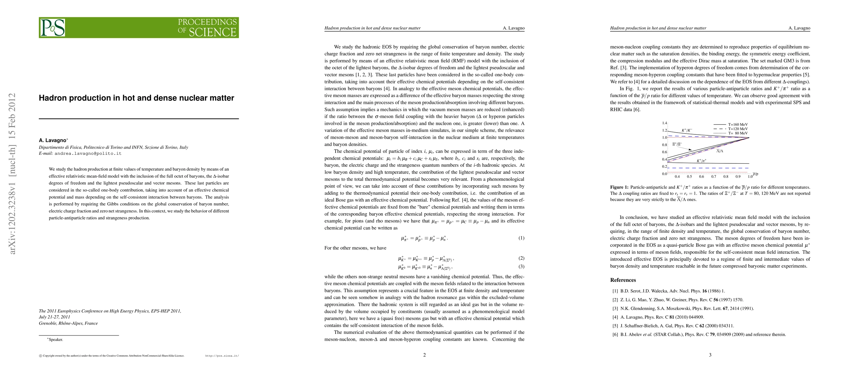 We study the hadron production at finite values of temperature and baryon density by means of an effective relativistic mean-field model with the inclusion of the full octet of baryons, the Delta-isobar degrees of freedom and the lightest pseudoscalar and vector mesons. These last particles are considered in the so-called one-body contribution, taking into account of an effective chemical potential and mass depending on the self-consistent interaction between baryons. The analysis is performed by requiring the Gibbs conditions on the global conservation of baryon number, electric charge fraction and zero net strangeness. In this context, we study the behavior of different particle-antiparticle ratios and strangeness production.