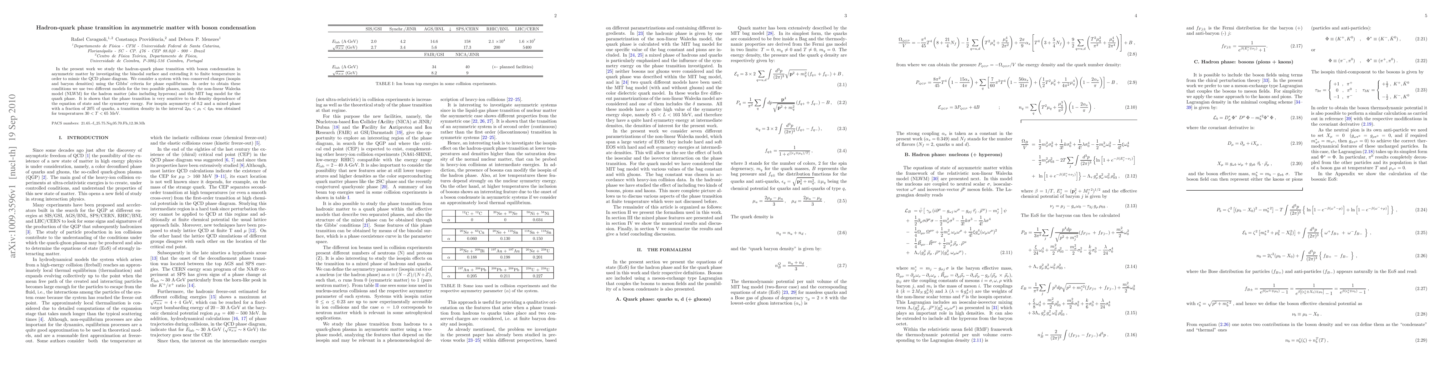 In the present work we study the hadron-quark phase transition with boson condensation in asymmetric matter by investigating the binodal surface and extending it to finite temperature in order to mimic the QCD phase diagram. We consider a system with two conserved charges (isospin and baryon densities) using the Gibbs' criteria for phase equilibrium. In order to obtain these conditions we use two different models for the two possible phases, namely the non-linear Walecka model (NLWM) for the hadron matter (also including hyperons) and the MIT bag model for the quark phase. It is shown that the phase transition is very sensitive to the density dependence of the equation of state and the symmetry energy. For isospin asymmetry of 0.2 and a mixed phase with a fraction of 20% of quarks, a transition density in the interval 2 rho_0 to 4 rho_0 was obtained for temperatures 30 < T < 65 MeV.