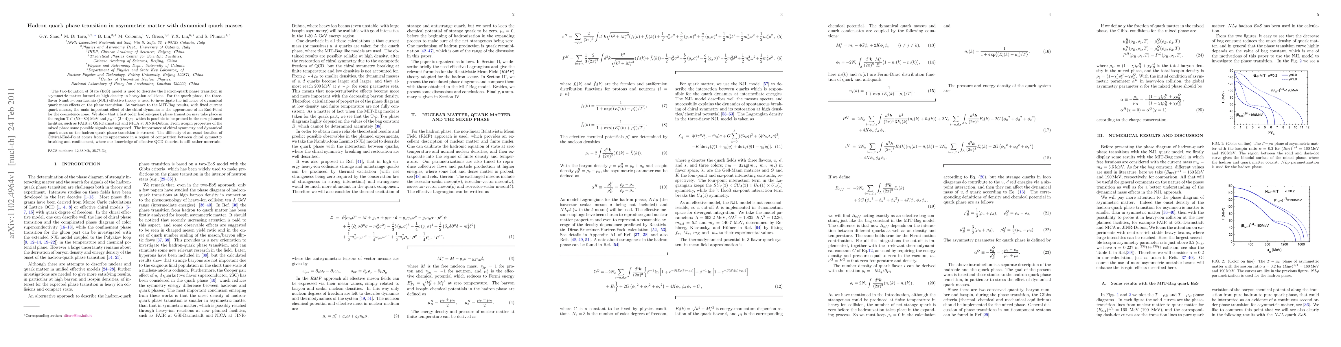 This paper investigates the hadron-quark phase transition in asymmetric matter using a two-EoS model and the Nambu-Jona-Lasinio theory, highlighting the impact of dynamical quark masses. It finds a first-order transition in a specific temperature and density range, suggesting possible experimental verification at new facilities.