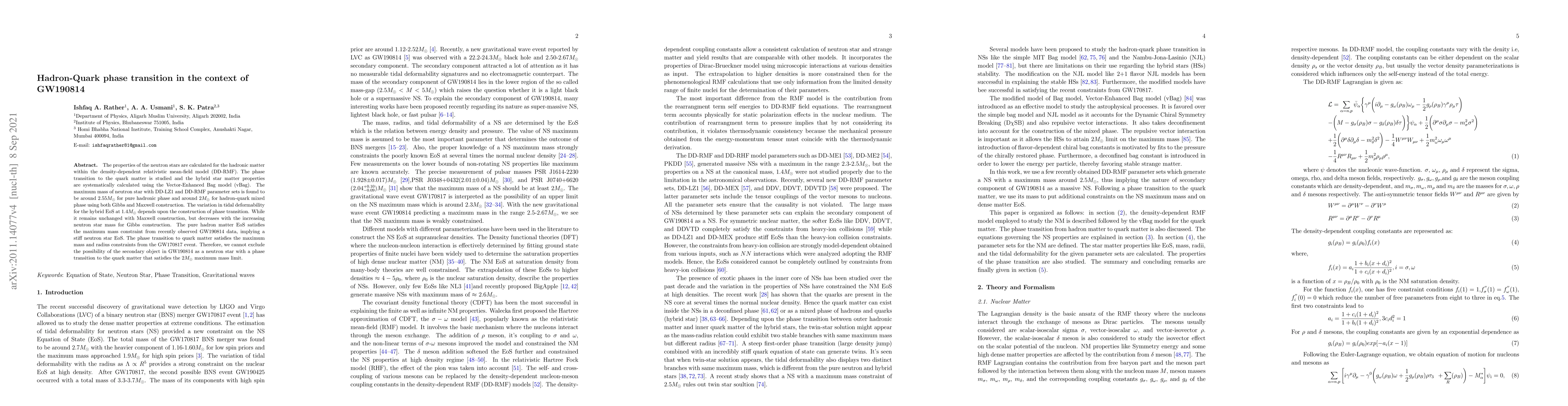This paper investigates neutron star properties and the hadron-quark phase transition using the DD-RMF model and vBag. It finds that a maximum mass of around 2.55$M_{\odot}$ is possible for pure hadronic stars, while a mixed phase yields around 2$M_{\odot}$. The study suggests that the secondary object in GW190814 could be a hybrid neutron star with a quark matter phase transition.