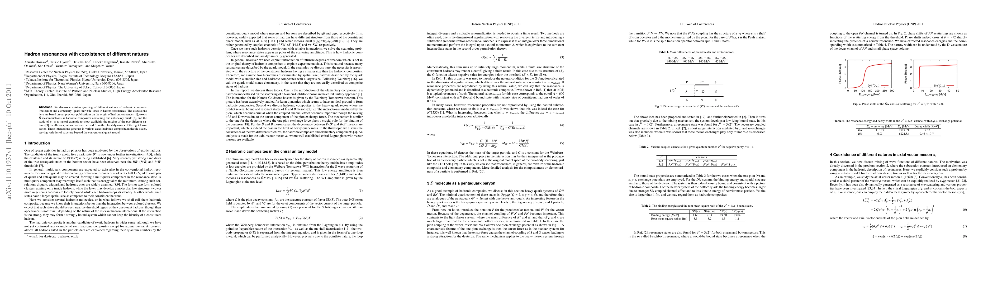 We discuss coexistence/mixing of different natures of hadronic composite (molecule) and elementary (quark-intrinsic) ones in hadron resonances. The discussions here are based on our previous publications on the origin of hadron resonances \cite{Hyodo:2008xr}, exotic $\bar D$ meson-nucleons as hadronic composites containing one anti-heavy quark \cite{Yamaguchi:2011xb}, and the study of $a_1$ as a typical example to show explicitly the mixing of the two different natures \cite{Nagahiro:2011jn}. In all cases, interactions are derived from the chiral dynamics of the light flavor sector. These interactions generate in various cases hadronic composite/molecule states, serving varieties of structure beyond the conventional quark model.