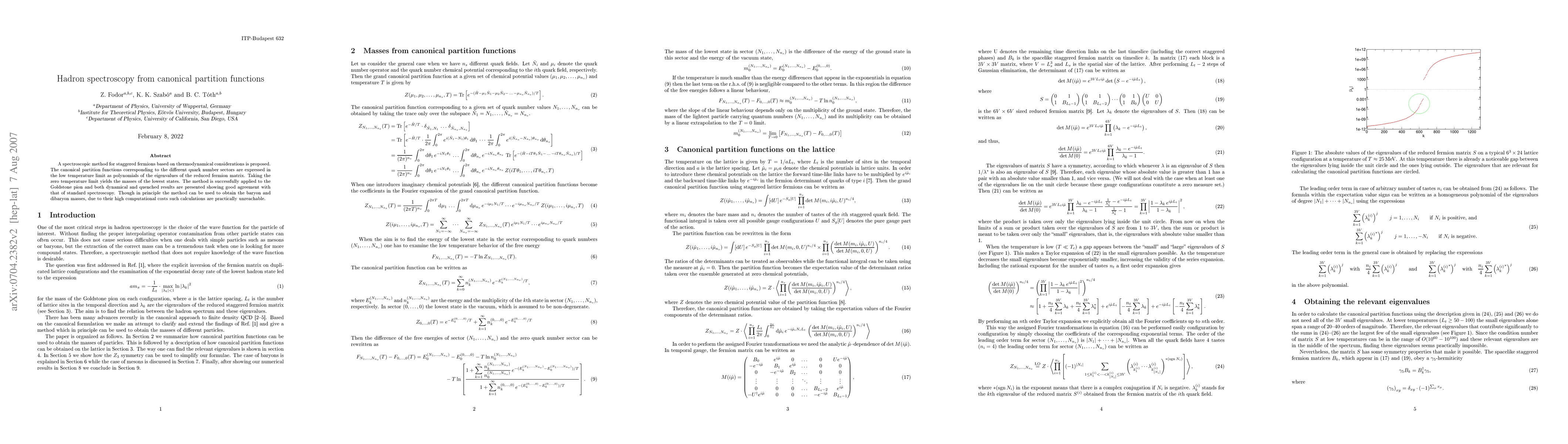 A spectroscopic method for staggered fermions based on thermodynamical considerations is proposed. The canonical partition functions corresponding to the different quark number sectors are expressed in the low temperature limit as polynomials of the eigenvalues of the reduced fermion matrix. Taking the zero temperature limit yields the masses of the lowest states. The method is successfully applied to the Goldstone pion and both dynamical and quenched results are presented showing good agreement with that of standard spectroscopy. Though in principle the method can be used to obtain the baryon and dibaryon masses, due to their high computational costs such calculations are practically unreachable.