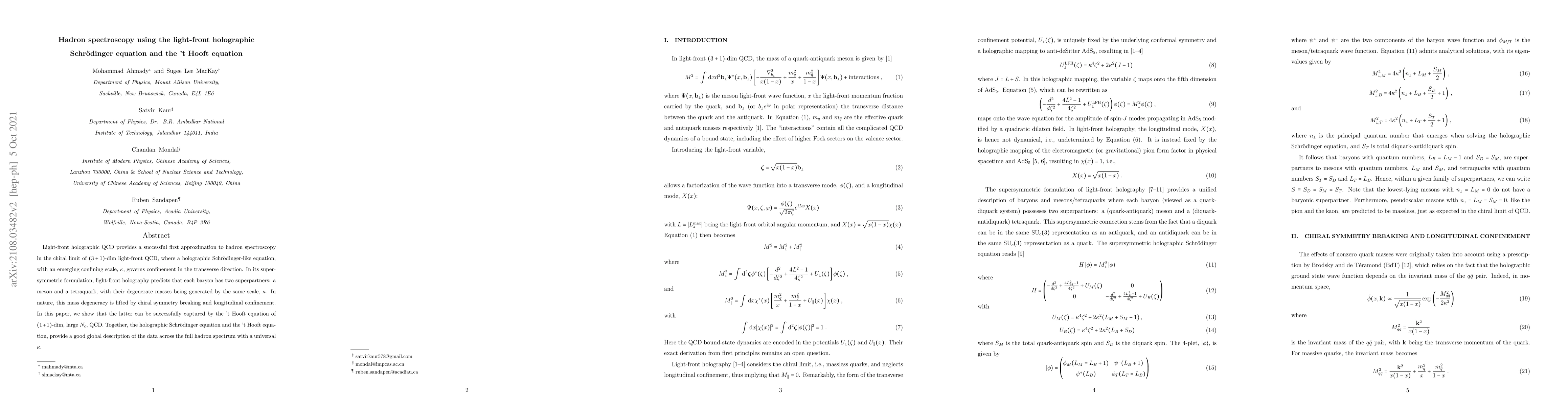 Light-front holographic QCD provides a successful first approximation to hadron spectroscopy in the chiral limit of $(3+1)$-dim light-front QCD, where a holographic Schr\"odinger-like equation, with an emerging confining scale, $\kappa$, governs confinement in the transverse direction. In its supersymmetric formulation, light-front holography predicts that each baryon has two superpartners: a meson and a tetraquark, with their degenerate masses being generated by the same scale, $\kappa$. In nature, this mass degeneracy is lifted by chiral symmetry breaking and longitudinal confinement. In this paper, we show that the latter can be successfully captured by the 't Hooft equation of $(1+1)$-dim, large $N_c$, QCD. Together, the holographic Schr\"odinger equation and the 't Hooft equation, provide a good global description of the data across the full hadron spectrum with a universal $\kappa$.