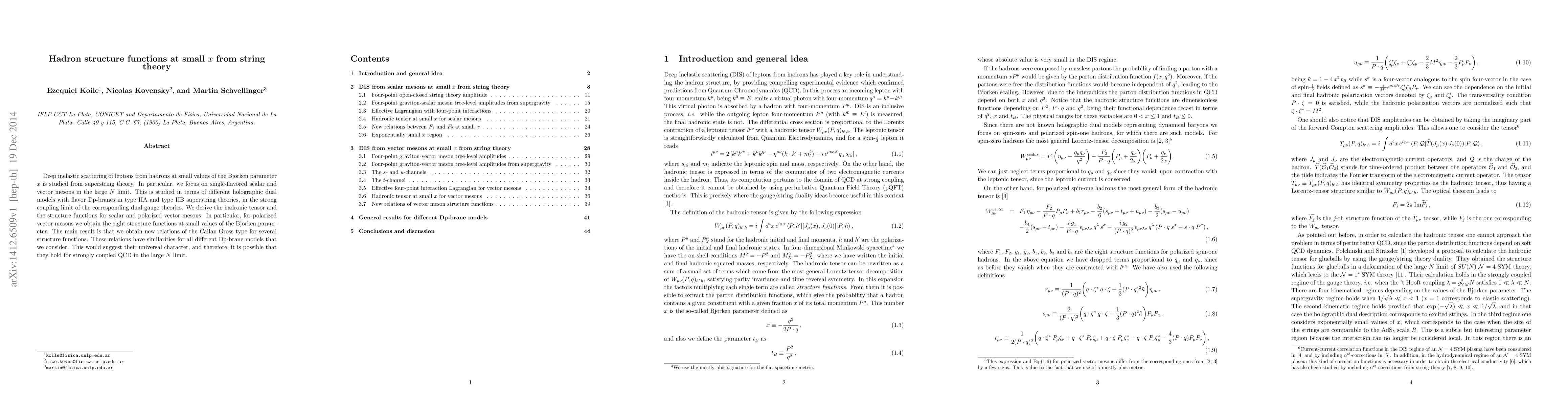 Deep inelastic scattering of leptons from hadrons at small values of the Bjorken parameter $x$ is studied from superstring theory. In particular, we focus on single-flavored scalar and vector mesons in the large $N$ limit. This is studied in terms of different holographic dual models with flavor Dp-branes in type IIA and type IIB superstring theories, in the strong coupling limit of the corresponding dual gauge theories. We derive the hadronic tensor and the structure functions for scalar and polarized vector mesons. In particular, for polarized vector mesons we obtain the eight structure functions at small values of the Bjorken parameter. The main result is that we obtain new relations of the Callan-Gross type for several structure functions. These relations have similarities for all different Dp-brane models that we consider. This would suggest their universal character, and therefore, it is possible that they hold for strongly coupled QCD in the large $N$ limit.