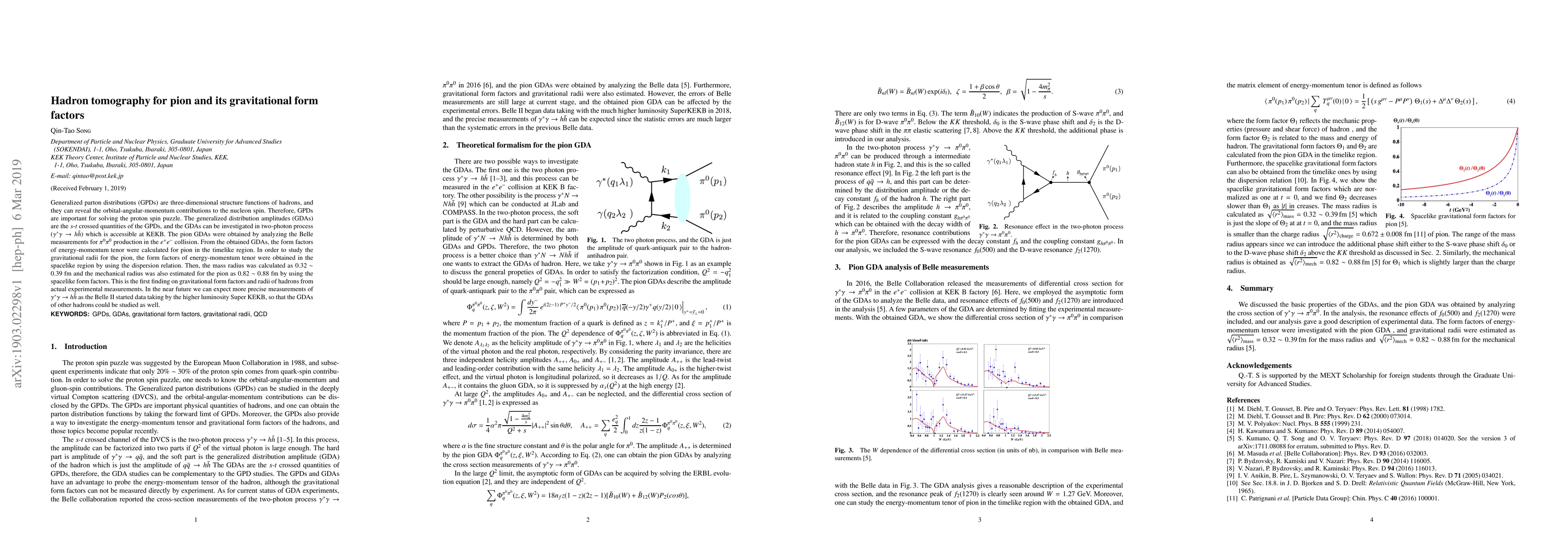 Generalized parton distributions (GPDs) are three-dimensional structure functions of hadrons, and they can reveal the orbital-angular-momentum contributions to the nucleon spin. Therefore, GPDs are important for solving the proton spin puzzle. The generalized distribution amplitudes (GDAs) are the $s$-$t$ crossed quantities of the GPDs, and the GDAs can be investigated in two-photon process ($\gamma^* \gamma \to h\bar h$) which is accessible at KEKB. The pion GDAs were obtained by analyzing the Belle measurements for $\pi^0 \pi^0$ production in the $e^+ e^-$ collision. From the obtained GDAs, the form factors of energy-momentum tenor were calculated for pion in the timelike region. In order to study the gravitational radii for the pion, the form factors of energy-momentum tenor were obtained in the spacelike region by using the dispersion relation. Then, the mass radius was calculated as 0.32 $\sim$ 0.39 fm and the mechanical radius was also estimated for the pion as 0.82 $\sim$ 0.88 fm by using the spacelike form factors. This is the first finding on gravitational form factors and radii of hadrons from actual experimental measurements. In the near future we can expect more precise measurements of $\gamma^* \gamma \to h\bar h$ as the Belle II started data taking by the higher luminosity Super KEKB, so that the GDAs of other hadrons could be studied as well.