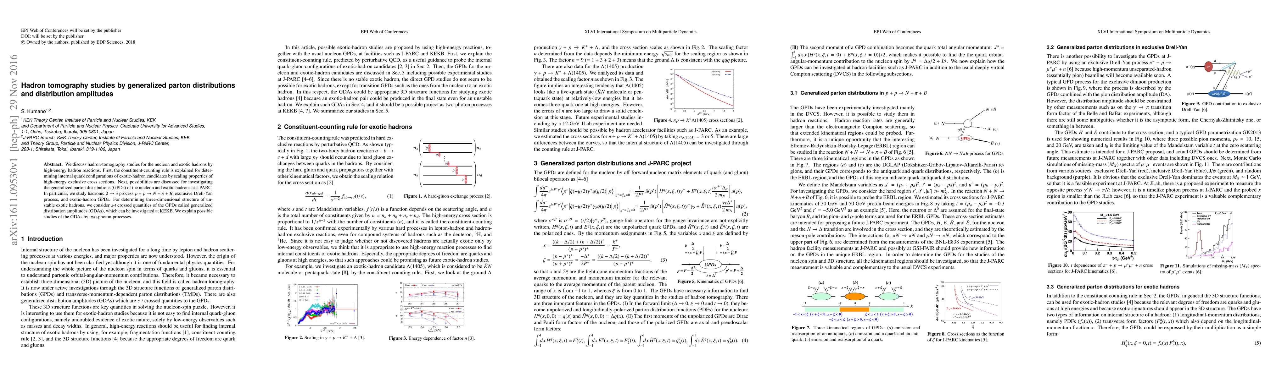 We discuss hadron-tomography studies for the nucleon and exotic hadrons by high-energy hadron reactions. First, the constituent-counting rule is explained for determining internal quark configurations of exotic-hadron candidates by scaling properties of high-energy exclusive cross sections. Next, possibilities are discussed for investigating the generalized parton distributions (GPDs) of the nucleon and exotic hadrons at J-PARC. In particular, we study hadronic $2 \to 3$ process $p+p \to N+\pi+B$, exclusive Drell-Yan process, and exotic-hadron GPDs. For determining three-dimensional structure of unstable exotic hadrons, we consider $s$-$t$ crossed quantities of the GPDs called generalized distribution amplitudes (GDAs), which can be investigated at KEKB. We explain possible studies of the GDAs by two-photon processes.