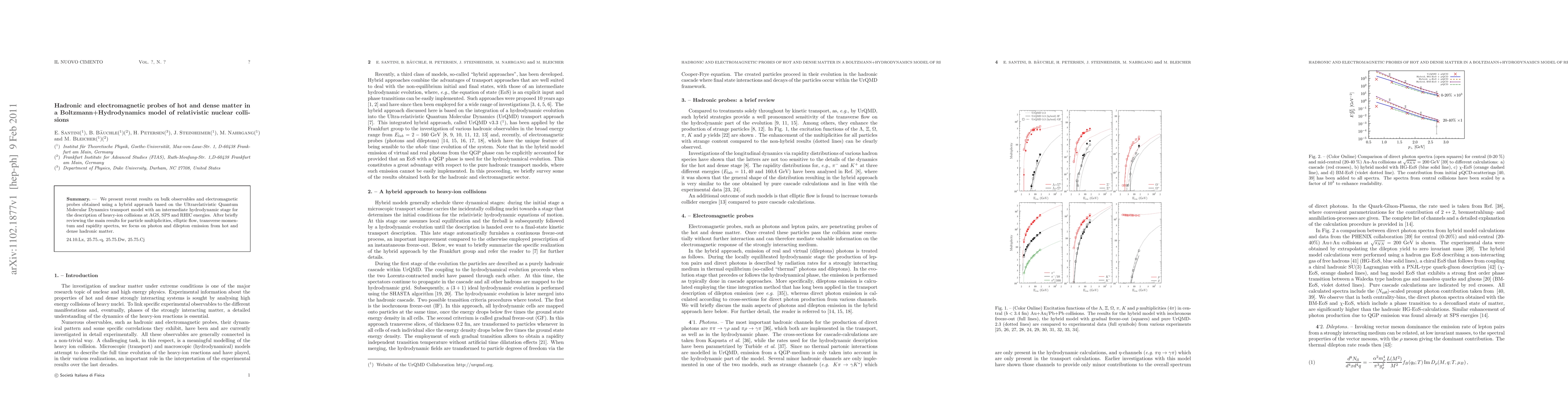 This paper investigates the behavior of hot and dense hadronic matter in relativistic nuclear collisions using a hybrid Boltzmann+Hydrodynamics model, focusing on bulk observables and electromagnetic probes like photon and dilepton emissions. The study combines the Ultrarelativistic Quantum Molecular Dynamics transport model with an intermediate hydrodynamic stage for analysis at AGS, SPS, and RHIC energies.