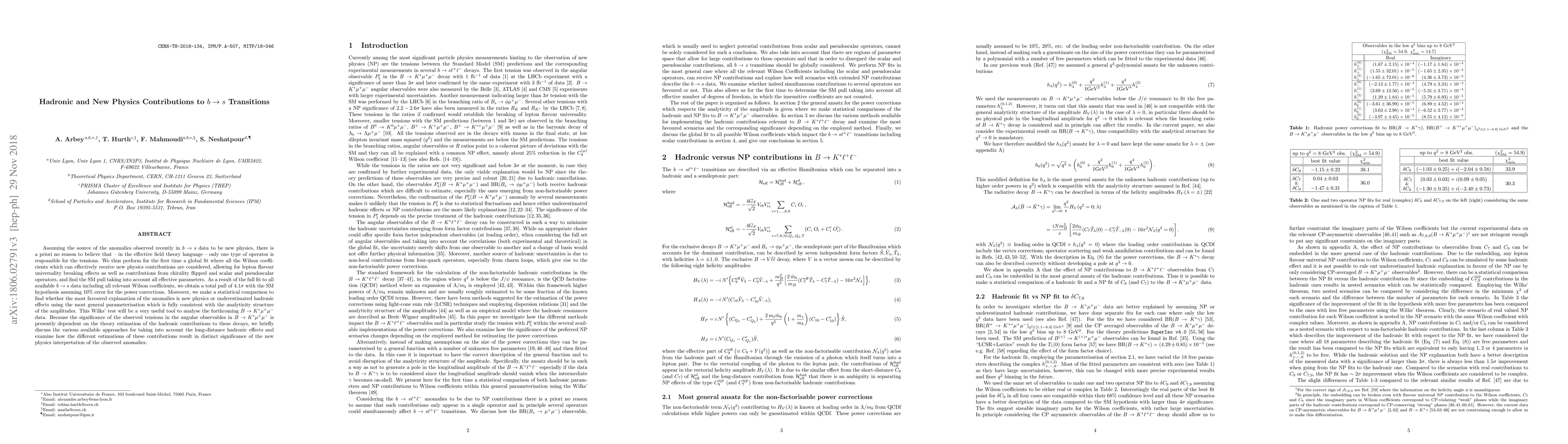 Assuming the source of the anomalies observed recently in $b \to s$ data to be new physics, there is a priori no reason to believe that - in the effective field theory language - only one type of operator is responsible for the tensions. We thus perform for the first time a global fit where all the Wilson coefficients which can effectively receive new physics contributions are considered, allowing for lepton flavour universality breaking effects as well as contributions from chirality flipped and scalar and pseudoscalar operators, and find the SM pull taking into account all effective parameters. As a result of the full fit to all available $b \to s$ data including all relevant Wilson coefficients, we obtain a total pull of 4.1$\sigma$ with the SM hypothesis assuming 10% error for the power corrections. Moreover, we make a statistical comparison to find whether the most favoured explanation of the anomalies is new physics or underestimated hadronic effects using the most general parameterisation which is fully consistent with the analyticity structure of the amplitudes. This Wilks' test will be a very useful tool to analyse the forthcoming $B\to K^* \mu^+ \mu^-$ data. Because the significance of the observed tensions in the angular observables in $B \to K^* \mu^+\mu^-$ is presently dependent on the theory estimation of the hadronic contributions to these decays, we briefly discuss the various available approaches for taking into account the long-distance hadronic effects and examine how the different estimations of these contributions result in distinct significance of the new physics interpretation of the observed anomalies.