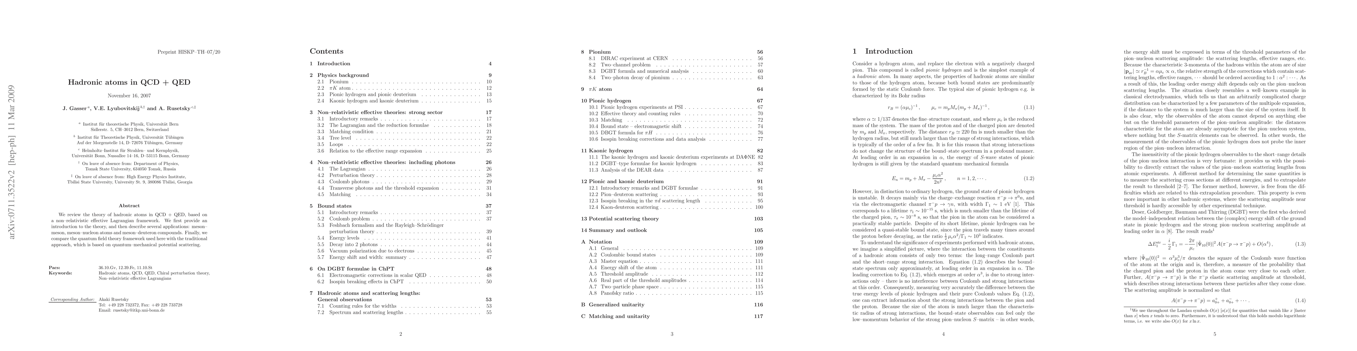 This paper reviews the theory of hadronic atoms within the framework of QCD + QED using a non-relativistic effective Lagrangian, detailing applications to meson-meson, meson-nucleon, and meson-deuteron systems, and comparing this approach to the traditional quantum-mechanical potential scattering method.