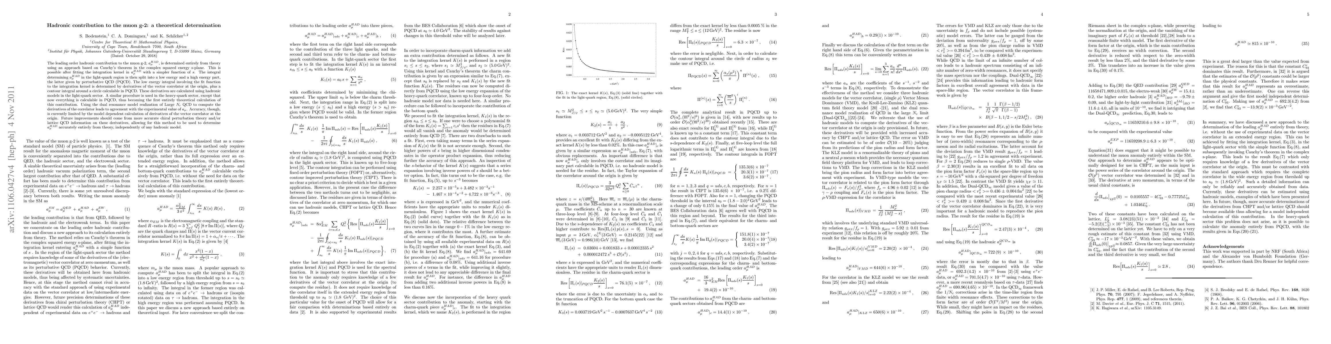 The leading order hadronic contribution to the muon g-2, $a_{\mu}^{HAD}$, is determined entirely from theory using an approach based on Cauchy's theorem in the complex squared energy s-plane. This is possible after fitting the integration kernel in $a_{\mu}^{HAD}$ with a simpler function of $s$. The integral determining $a_{\mu}^{HAD}$ in the light-quark region is then split into a low energy and a high energy part, the latter given by perturbative QCD (PQCD). The low energy integral involving the fit function to the integration kernel is determined by derivatives of the vector correlator at the origin, plus a contour integral around a circle calculable in PQCD. These derivatives are calculated using hadronic models in the light-quark sector. A similar procedure is used in the heavy-quark sector, except that now everything is calculable in PQCD, thus becoming the first entirely theoretical calculation of this contribution. Using the dual resonance model realization of Large $N_{c}$ QCD to compute the derivatives of the correlator leads to agreement with the experimental value of $a_\mu$. Accuracy, though, is currently limited by the model dependent calculation of derivatives of the vector correlator at the origin. Future improvements should come from more accurate chiral perturbation theory and/or lattice QCD information on these derivatives, allowing for this method to be used to determine $a_{\mu}^{HAD}$ accurately entirely from theory, independently of any hadronic model.