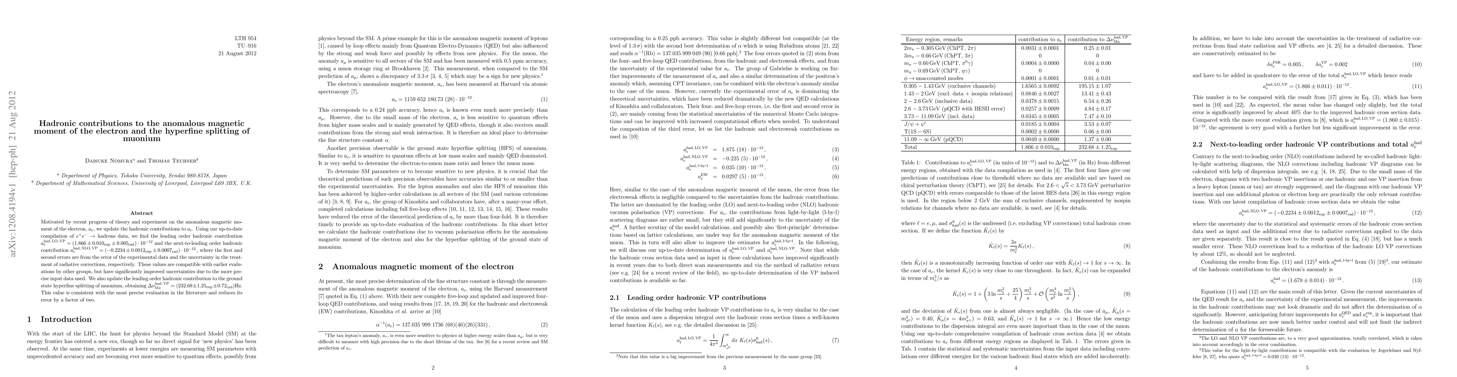 This paper updates the hadronic contributions to the anomalous magnetic moment of the electron and the hyperfine splitting of muonium using improved experimental data and theoretical methods, resulting in significantly reduced uncertainties. The leading order hadronic contribution to the electron's anomalous magnetic moment is found to be \((1.866 \pm 0.010_{exp} \pm 0.005_{rad}) \cdot 10^{-12}\), and the next-to-leading order contribution is \((- 0.2234 \pm 0.0012_{exp} \pm 0.0007_{rad}) \cdot 10^{-12}\).