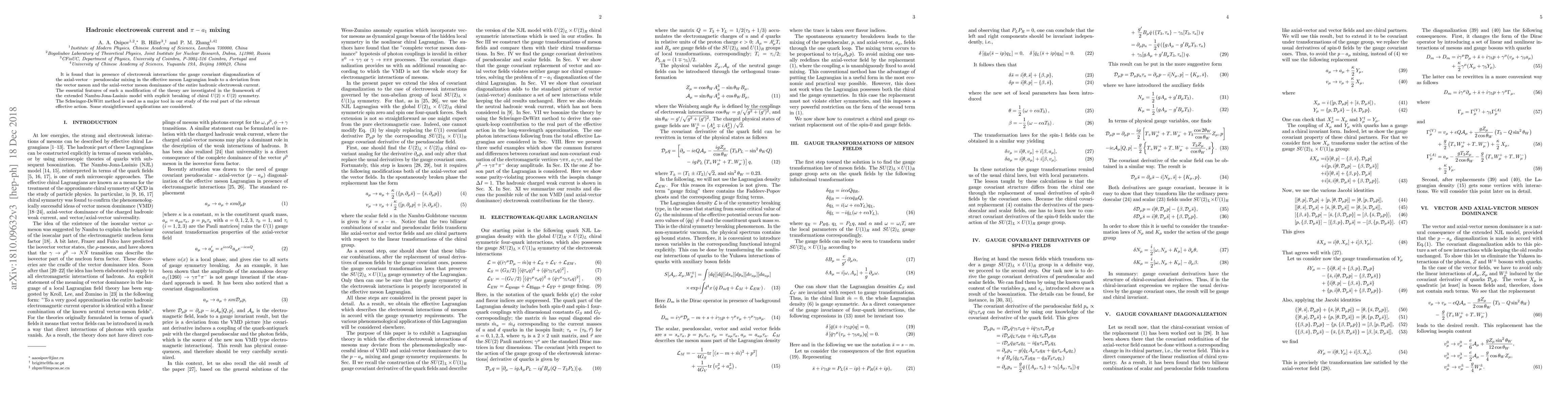 It is found that in presence of electroweak interactions the gauge covariant diagonalization of the axial-vector -- pseudoscalar mixing in the effective meson Lagrangian leads to a deviation from the vector meson and the axial-vector meson dominance of the entire hadronic electroweak current. The essential features of such a modification of the theory are investigated in the framework of the extended Nambu-Jona-Lasinio model with explicit breaking of chiral $U(2) \times U(2)$ symmetry. The Schwinger-DeWitt method is used as a major tool in our study of the real part of the relevant effective action. Some straightforward applications are considered.