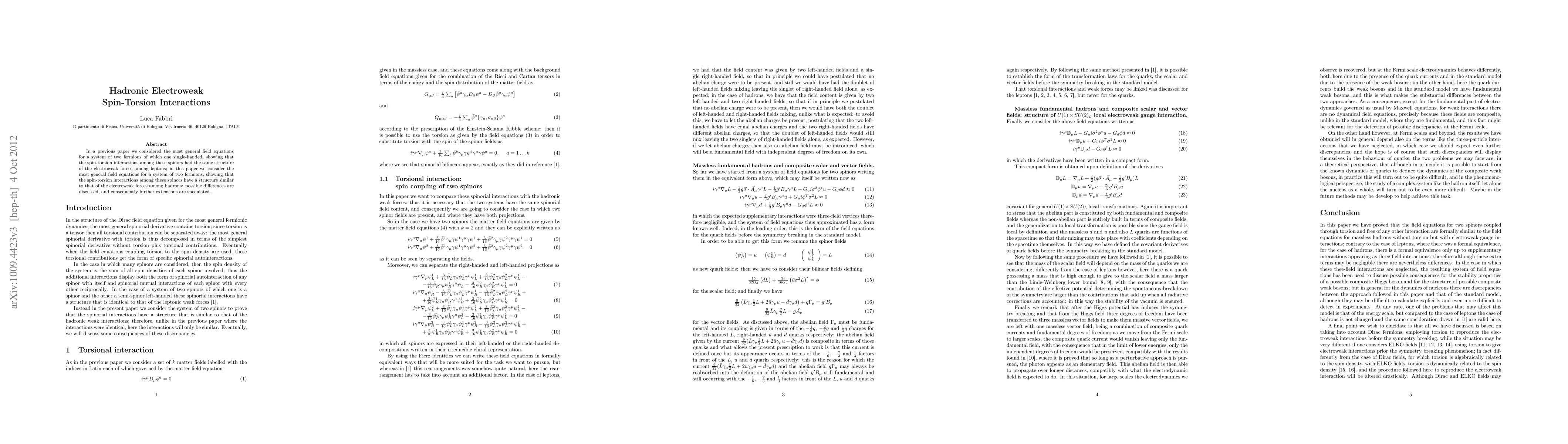 In a previous paper we considered the most general field equations for a system of two fermions of which one single-handed, showing that the spin-torsion interactions among these spinors had the same structure of the electroweak forces among leptons; in this paper we consider the most general field equations for a system of two fermions, showing that the spin-torsion interactions among these spinors have a structure similar to that of the electroweak forces among hadrons: possible differences are discussed, and consequently further extensions are speculated.