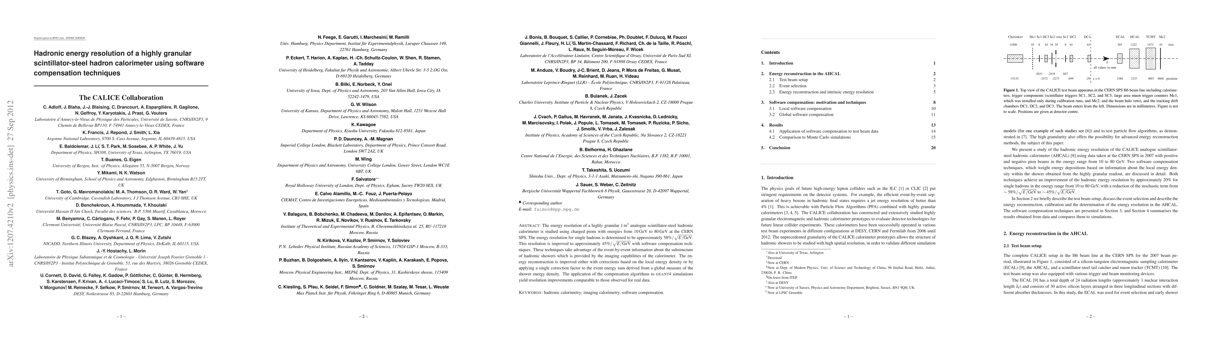 This paper investigates the energy resolution of a granular scintillator-steel hadronic calorimeter, achieving approximately 58%/%sqrt(E/GeV) with charged pions. Software compensation techniques improve this to about 45%/%sqrt(E/GeV) by utilizing event-by-event data to correct for local energy density variations.