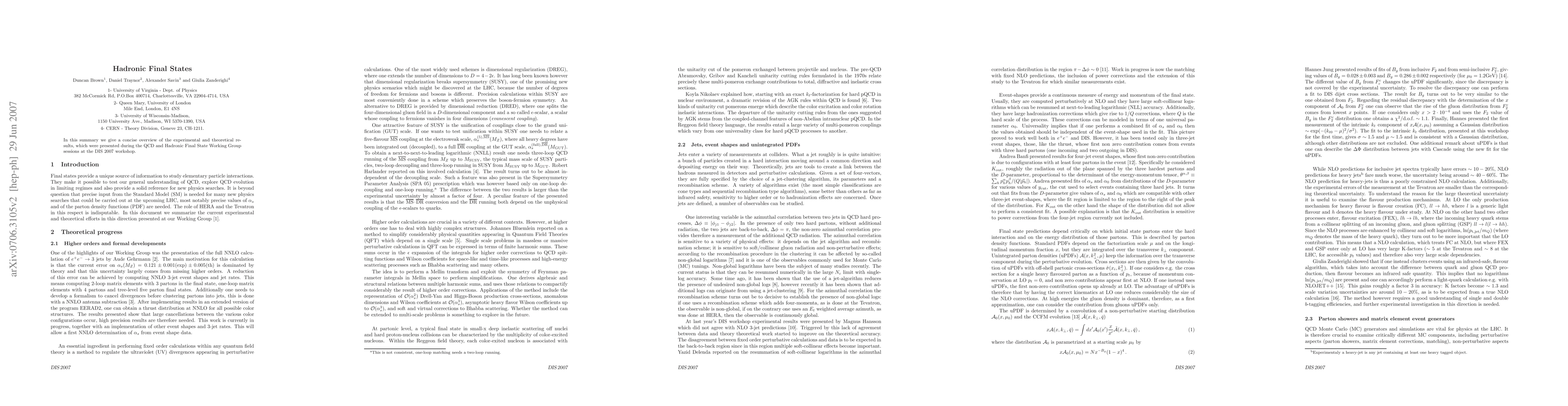 This paper provides a brief overview of experimental and theoretical findings presented at the QCD and Hadronic Final State Working Group sessions during the DIS 2007 workshop, focusing on the results related to hadronic final states.