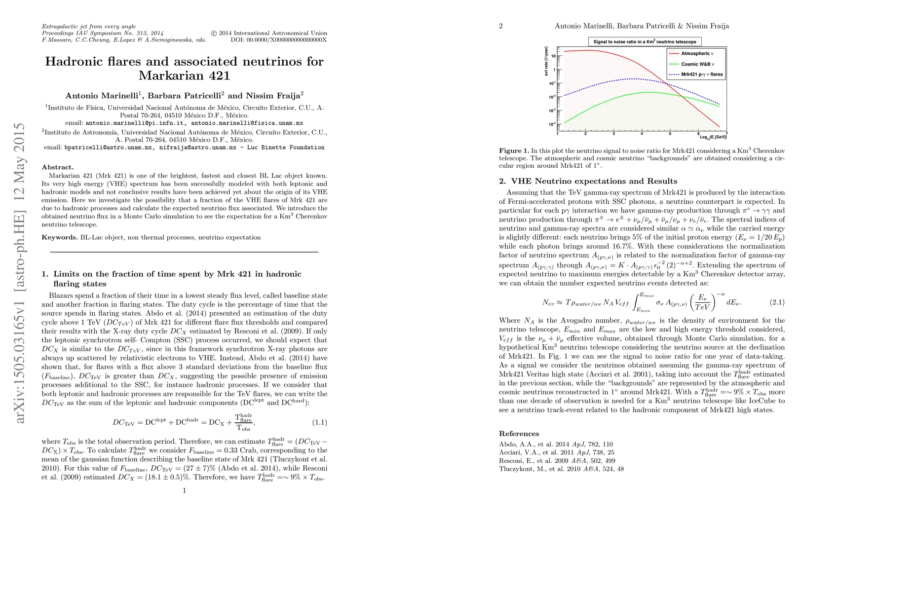 The study investigates the possibility of hadronic processes contributing to VHE flares in Markarian 421 and calculates the expected neutrino flux associated.
