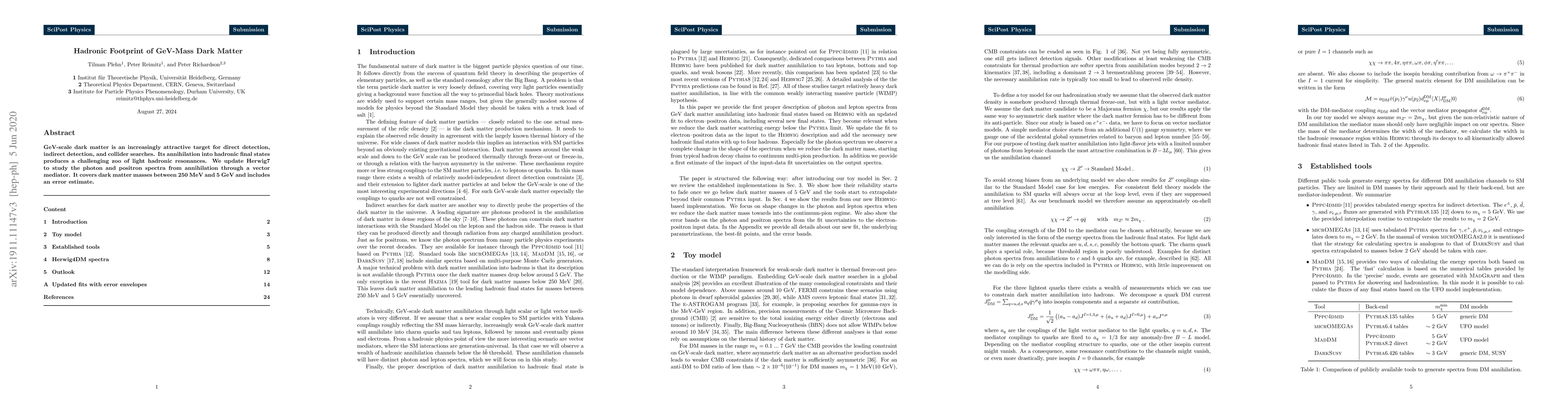 This paper updates Herwig7 to analyze the photon and positron spectra from GeV-scale dark matter annihilation via a vector mediator, focusing on the hadronic footprints and light resonances produced in the process, with a range of dark matter masses from 250 MeV to 5 GeV and an associated error estimate.