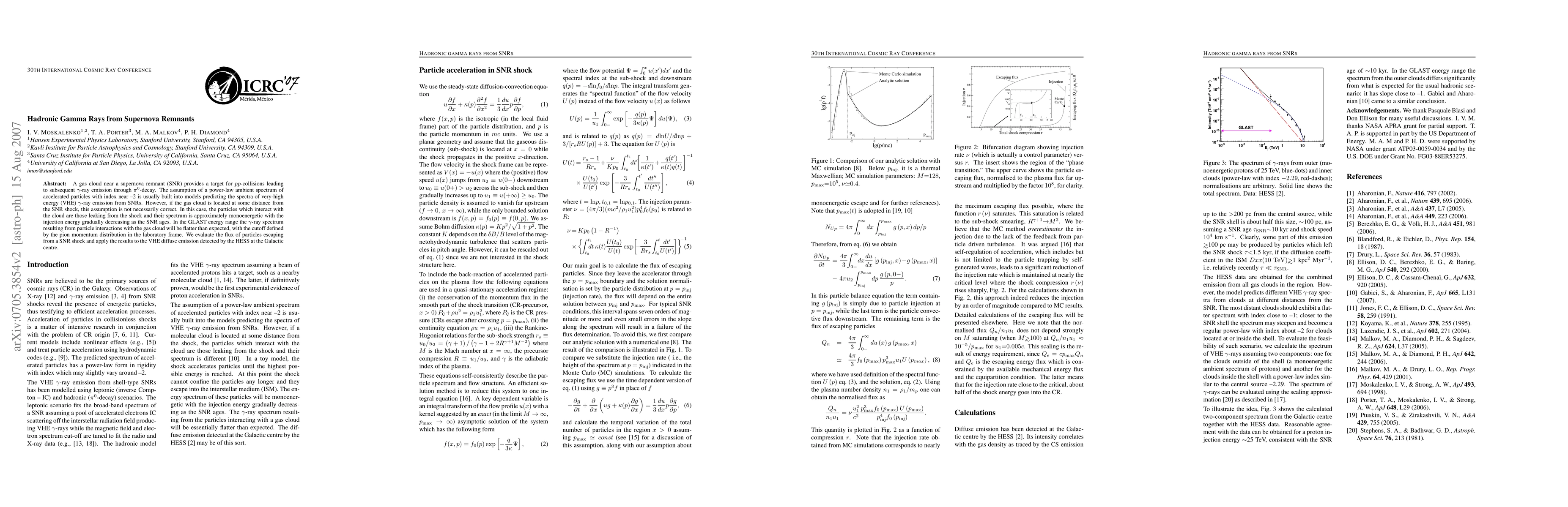 A gas cloud near a supernova remnant (SNR) provides a target for pp-collisions leading to subsequent gamma-ray emission through neutral pion decay. The assumption of a power-law ambient spectrum of accelerated particles with index near -2 is usually built into models predicting the spectra of very-high energy (VHE) gamma-ray emission from SNRs. However, if the gas cloud is located at some distance from the SNR shock, this assumption is not necessarily correct. In this case, the particles which interact with the cloud are those leaking from the shock and their spectrum is approximately monoenergetic with the injection energy gradually decreasing as the SNR ages. In the GLAST energy range the gamma-ray spectrum resulting from particle interactions with the gas cloud will be flatter than expected, with the cutoff defined by the pion momentum distribution in the laboratory frame. We evaluate the flux of particles escaping from a SNR shock and apply the results to the VHE diffuse emission detected by the HESS at the Galactic centre.