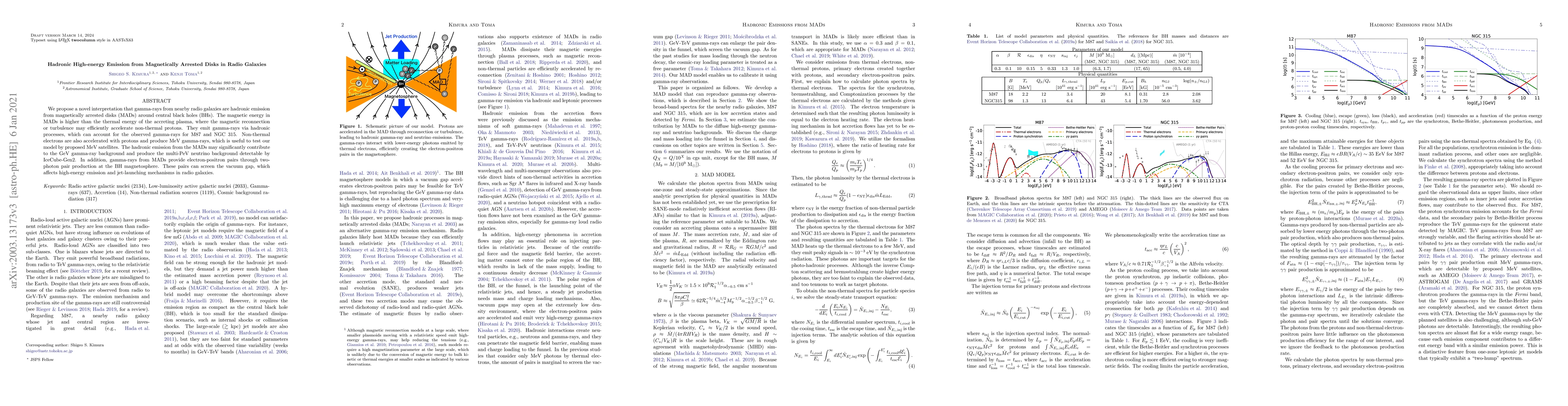 This paper proposes that gamma-rays from radio galaxies originate from hadronic processes in magnetically arrested disks around black holes, where magnetic energy accelerates protons to emit gamma-rays. The model also predicts contributions to the GeV gamma-ray and multi-PeV neutrino backgrounds, and suggests electron-positron pairs from vacuum gaps affect high-energy emission and jet mechanisms.
