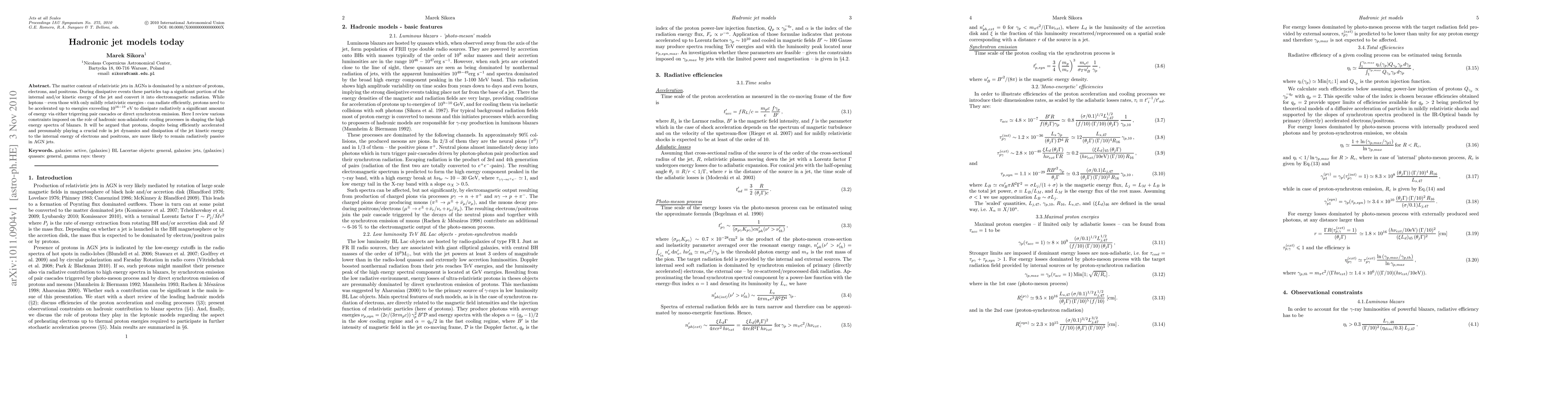 The paper discusses hadronic jet models in Active Galactic Nuclei (AGNs), emphasizing that while protons are efficiently accelerated, they are unlikely to significantly contribute to high-energy radiation due to their inefficient radiative processes compared to leptons. The review focuses on constraints affecting hadronic non-adiabatic cooling processes in blazar spectra.