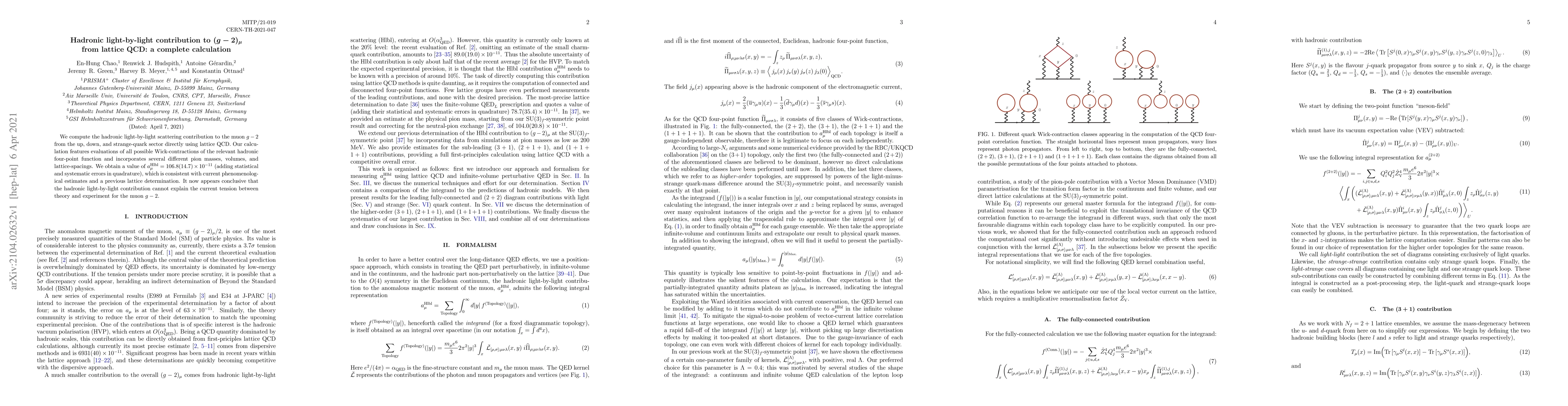 This paper presents a complete lattice QCD calculation of the hadronic light-by-light contribution to the muon's anomalous magnetic moment ($g-2$), yielding $a_\mu^{\text{Hlbl}} = 106.8(14.7) \times 10^{-11}$. The study concludes that this contribution does not resolve the discrepancy between theoretical predictions and experimental measurements for the muon $g-2$.