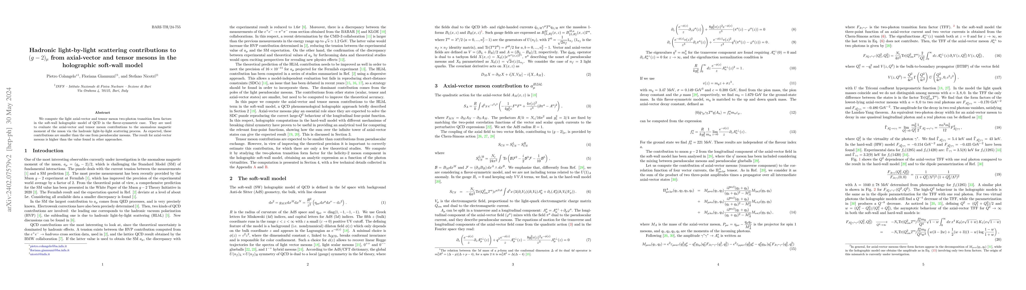 This paper evaluates the contributions of axial-vector and tensor mesons to the muon's anomalous magnetic moment through hadronic light-by-light scattering, using the soft-wall holographic model of QCD. The findings show these contributions are smaller than those from pseudoscalar mesons, and the axial-vector mesons' result exceeds previous estimates.