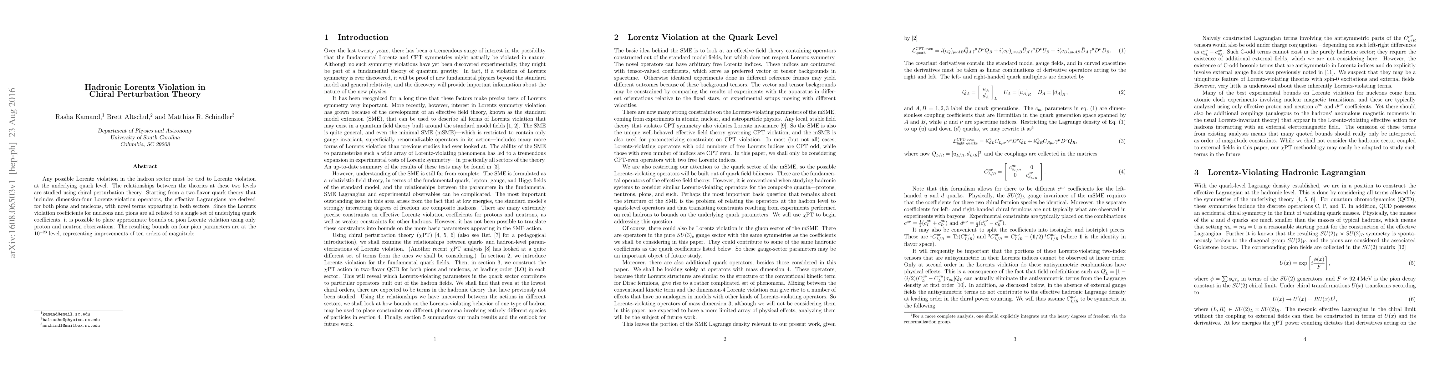 Any possible Lorentz violation in the hadron sector must be tied to Lorentz violation at the underlying quark level. The relationships between the theories at these two levels are studied using chiral perturbation theory. Starting from a two-flavor quark theory that includes dimension-four Lorentz-violation operators, the effective Lagrangians are derived for both pions and nucleons, with novel terms appearing in both sectors. Since the Lorentz violation coefficients for nucleons and pions are all related to a single set of underlying quark coefficients, it is possible to place approximate bounds on pion Lorentz violation using only proton and neutron observations. The resulting bounds on four pion parameters are at the $10^{-23}$ level, representing improvements of ten orders of magnitude.