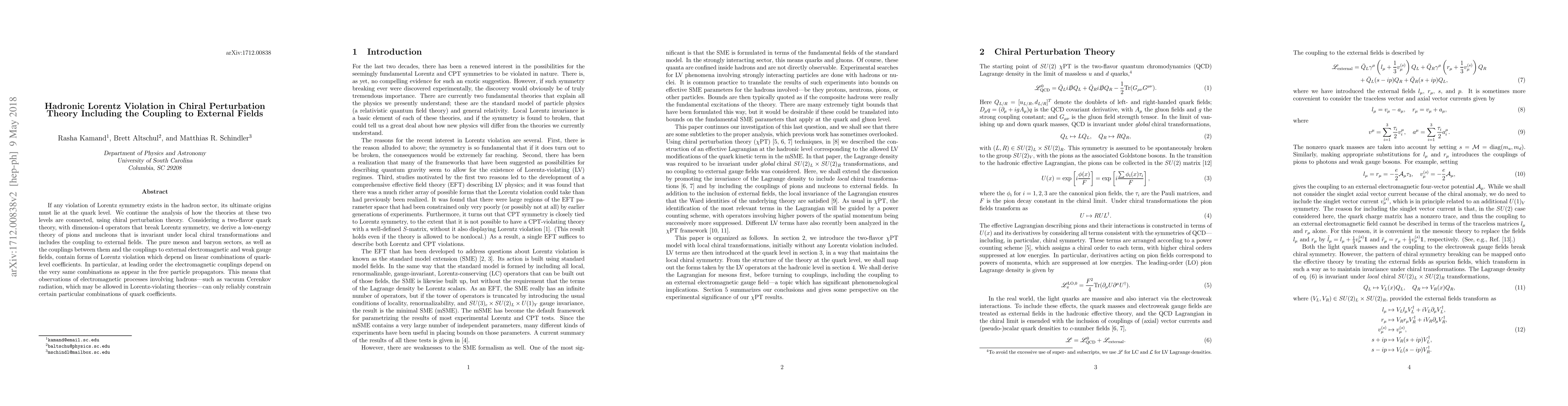 This paper explores how Lorentz symmetry violations at the quark level manifest in hadron interactions using chiral perturbation theory. It derives a low-energy theory for pions and nucleons that includes Lorentz-violating terms dependent on quark-level coefficients, affecting electromagnetic and weak gauge field couplings.