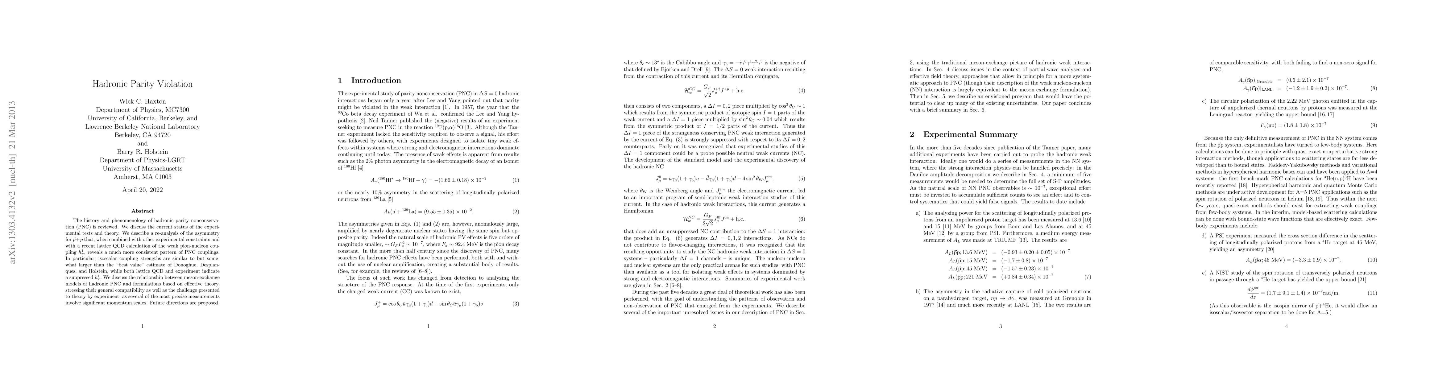 This paper reviews the history and phenomenology of hadronic parity nonconservation, presenting a re-analysis of polarized proton-proton scattering asymmetry that aligns better with current experimental and lattice QCD data. It highlights a suppressed parity-nonconserving pion-nucleon coupling and discusses the compatibility of meson-exchange models with effective theory approaches.