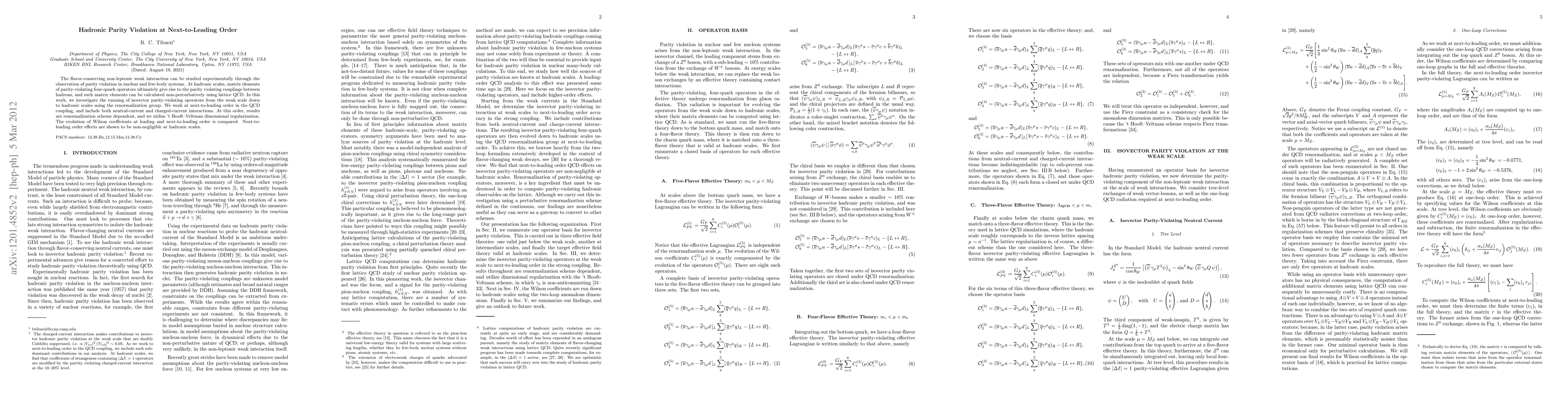 The flavor-conserving non-leptonic weak interaction can be studied experimentally through the observation of parity violation in nuclear and few-body systems. At hadronic scales, matrix elements of parity-violating four-quark operators ultimately give rise to the parity violating couplings between hadrons, and such matrix elements can be calculated non-perturbatively using lattice QCD. In this work, we investigate the running of isovector parity-violating operators from the weak scale down to hadronic scales using the renormalization group. We work at next-to-leading order in the QCD coupling, and include both neutral-current and charged-current interactions. At this order, results are renormalization scheme dependent, and we utilize 't Hooft-Veltman dimensional regularization. The evolution of Wilson coefficients at leading and next-to-leading order is compared. Next-to-leading order effects are shown to be non-negligible at hadronic scales.