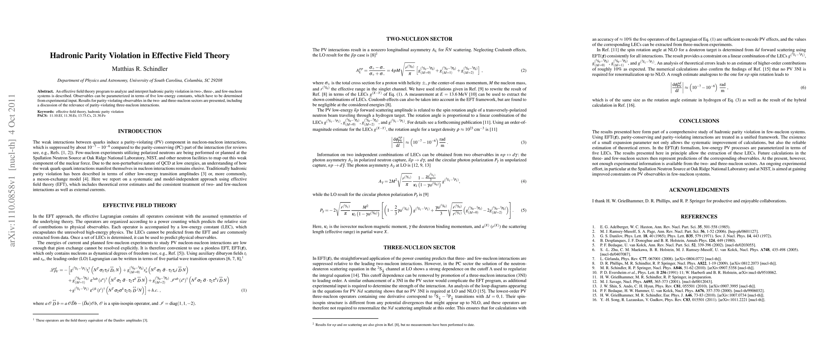 Hadronic parity violation in few-nucleon systems is studied using effective field theory, providing a systematic and model-independent approach.