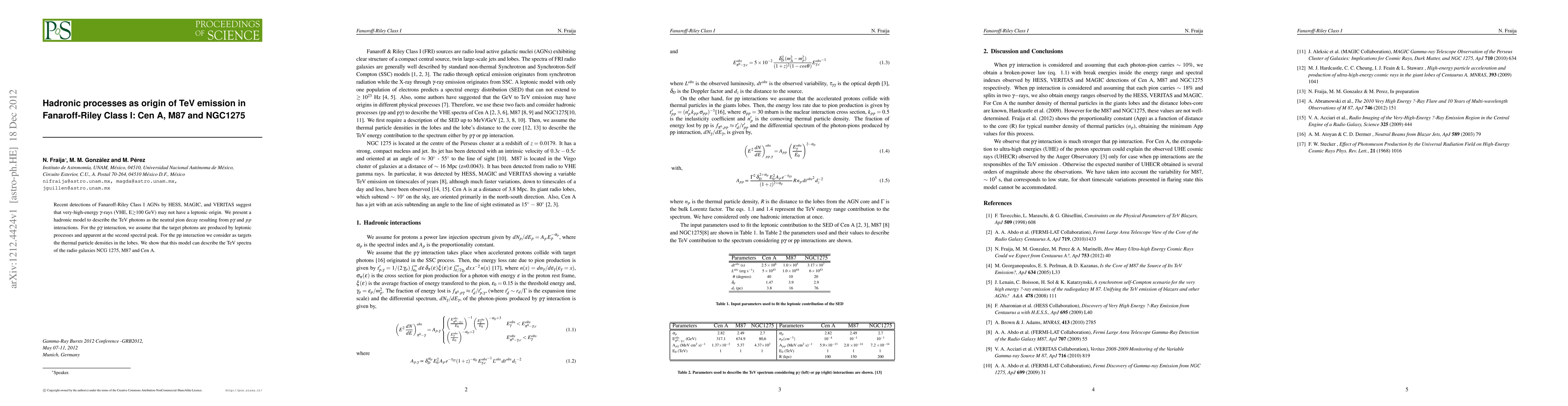 Recent detections of Fanaroff-Riley Class I AGNs by HESS, MAGIC, and VERITAS suggest that very-high-energy gamma-rays (VHE, E > 100 GeV) may not have a leptonic origin. We present a hadronic model to describe the TeV photons as the neutral pion decay resulting from pgamma and pp interactions. For the pgamma interaction, we assume that the target photons are produced by leptonic processes and apparent at the second spectral peak. For the pp interaction we consider as targets the thermal particle densities in the lobes. We show that this model can describe the TeV spectra of the radio galaxies NCG 1275, M87 and Cen A