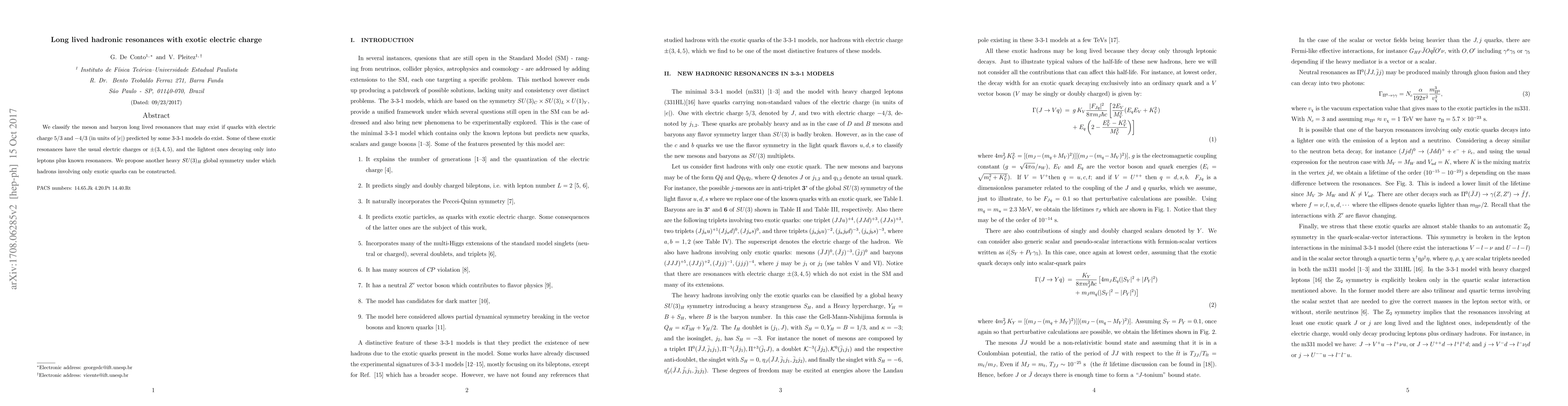 We classify the meson and baryon long lived resonances considering quarks with electric charge 5/3 and $-4/3$ (in units of $\vert e\vert$) predicted by some 3-3-1 models. Some of these exotic resonances have the usual electric charges $0,\pm1$, others have $\pm(3,4,5)$, and the lightest ones decaying only into leptons plus known resonances. We propose another heavy $SU(3)_H$ global symmetry under which hadrons involving only exotic quarks can be constructed.