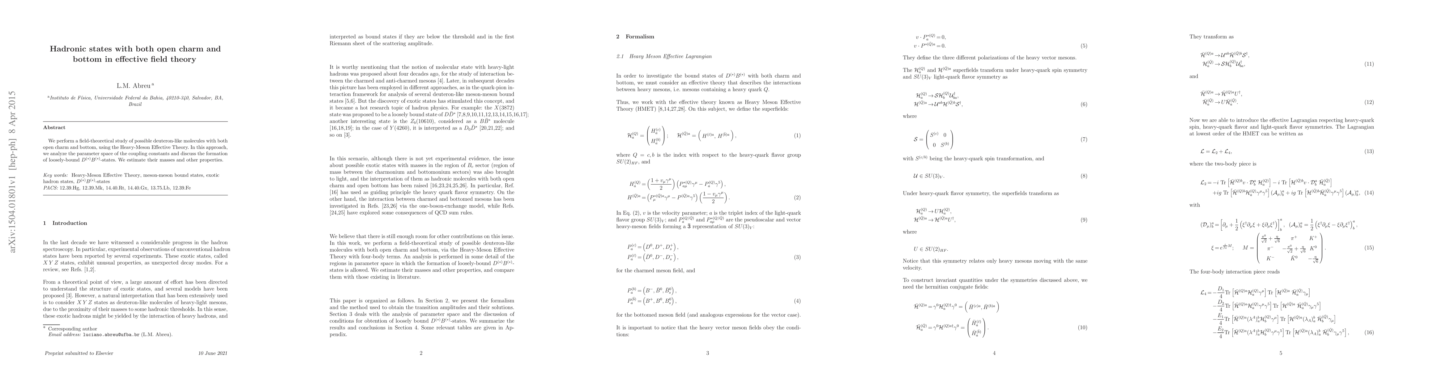 We perform a field-theoretical study of possible deuteron-like molecules with both open charm and bottom, using the Heavy-Meson Effective Theory. In this approach, we analyze the parameter space of the coupling constants and discuss the formation of loosely-bound $D^{(*)} B^{(*)} $-states. We estimate their masses and other properties.