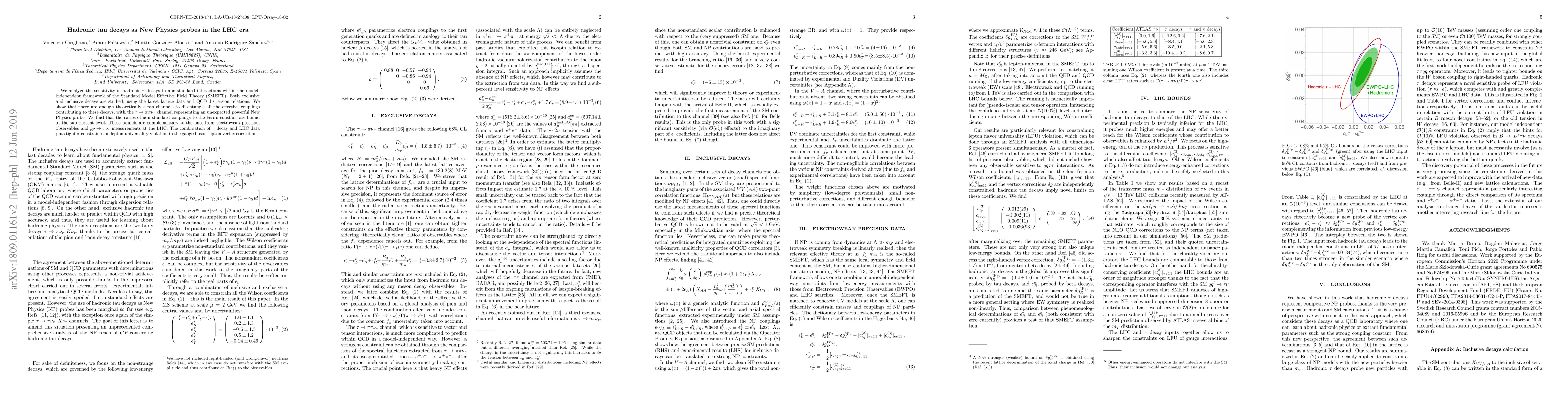 We analyze the sensitivity of hadronic tau decays to non-standard interactions within the model-independent framework of the Standard Model Effective Field Theory (SMEFT). Both exclusive and inclusive decays are studied, using the latest lattice data and QCD dispersion relations. We show that there are enough theoretically clean channels to disentangle all the effective couplings contributing to these decays, with the $\tau \to \pi\pi\nu_\tau$ channel representing an unexpected powerful New Physics probe. We find that the ratios of non-standard couplings to the Fermi constant are bound at the sub-percent level. These bounds are complementary to the ones from electroweak precision observables and $p p \to \tau \nu_\tau$ measurements at the LHC. The combination of tau decay and LHC data puts tighter constraints on lepton universality violation in the gauge boson-lepton vertex corrections.