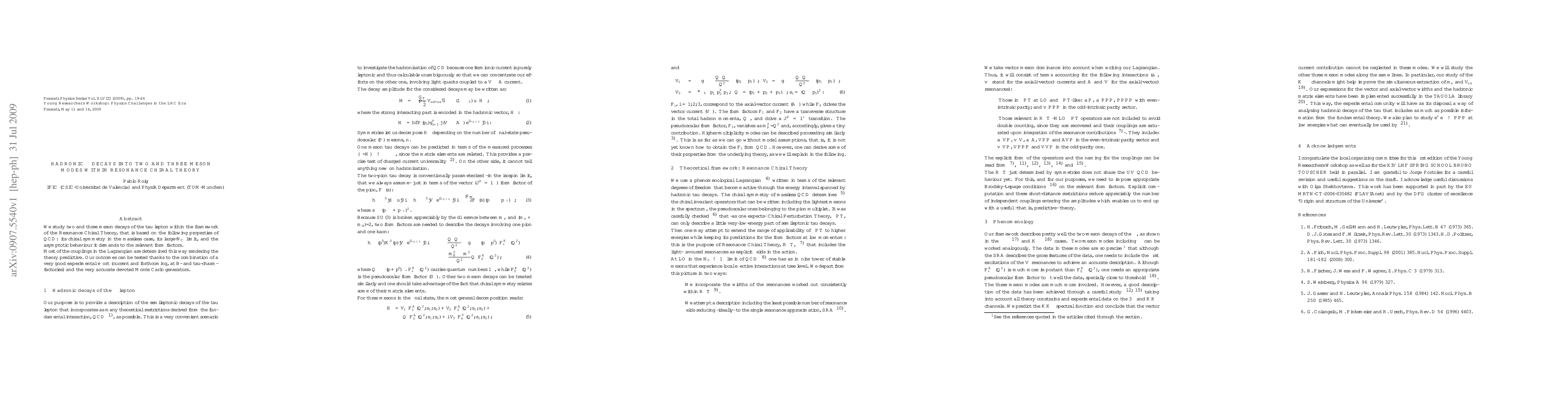 We study two and three meson decays of the tau lepton within the framework of the Resonance Chiral Theory, that is based on the following properties of QCD: its chiral symmetry in the massless case, its large-N_C limit, and the asymptotic behaviour it demands to the relevant form factors. Most of the couplings in the Lagrangian are determined this way rendering the theory predictive. Our outcomes can be tested thanks to the combination of a very good experimental effort (current and forthcoming, at B- and tau-charm-factories) and the very accurate devoted Monte Carlo generators.