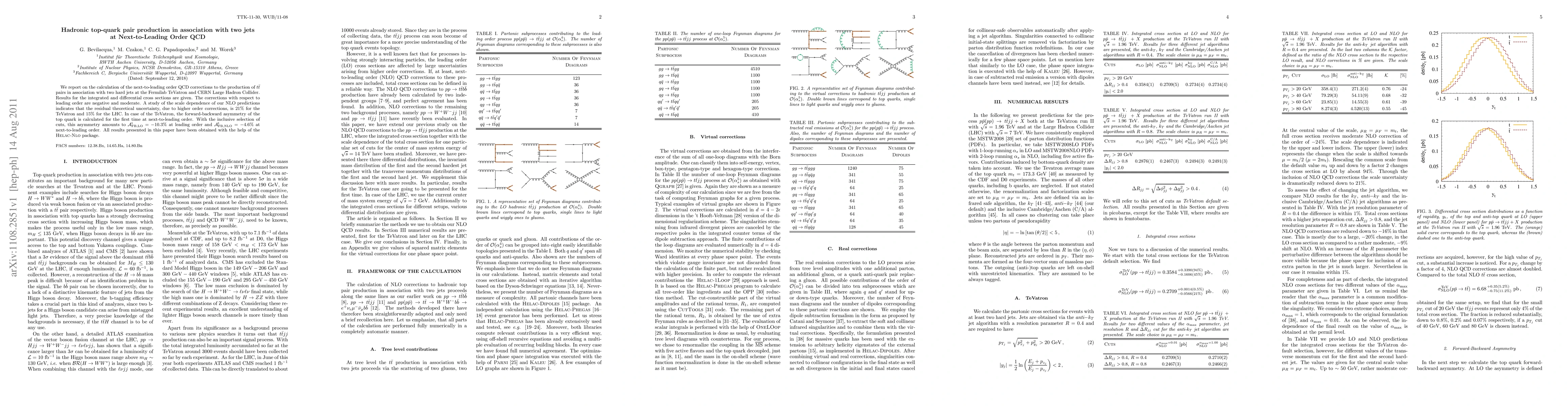 We report on the calculation of the next-to-leading order QCD corrections to the production of ttbar pairs in association with two hard jets at the Fermilab TeVatron and CERN Large Hadron Collider. Results for the integrated and differential cross sections are given. The corrections with respect to leading order are negative and moderate. A study of the scale dependence of our NLO predictions indicates that the residual theoretical uncertainty, due to higher order corrections, is 21% for the TeVatron and 15% for the LHC. In case of the TeVatron, the forward-backward asymmetry of the top quark is calculated for the first time at next-to-leading order. With the inclusive selection of cuts, this asymmetry amounts to A_FB = -10.3% at leading order and A_FB = -4.6% at next-to-leading order. All results presented in this paper have been obtained with the help of the HELAC-NLO package.