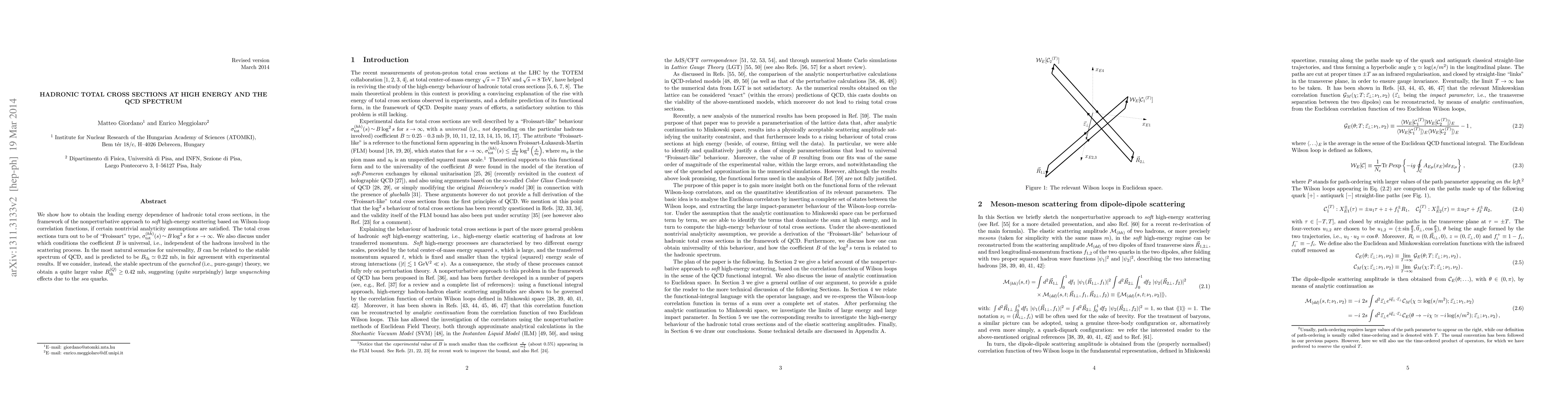 This paper derives the leading energy dependence of hadronic total cross sections using a nonperturbative approach based on Wilson-loop correlation functions, showing that $\sigma_{\rm tot}^{(hh)}(s) \sim B\log^2 s$ for high energy. The coefficient $B$ is found to be universal and related to the QCD spectrum, predicted to be $B_{\rm th} \simeq 0.22~{\rm mb}$, consistent with experiments, while the quenched theory suggests larger values indicating significant unquenching effects.