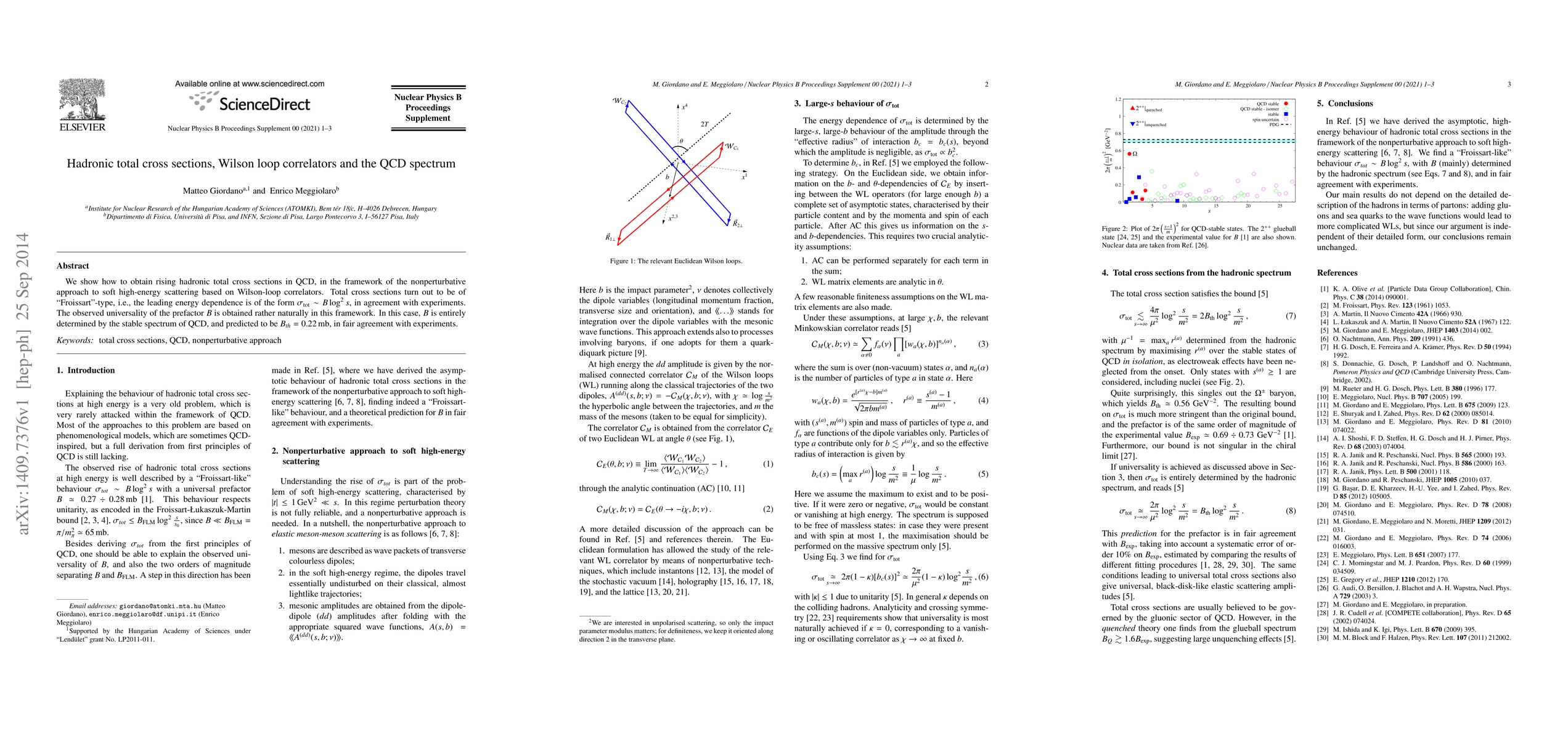 This paper demonstrates a nonperturbative QCD approach using Wilson-loop correlators to derive rising hadronic total cross sections, showing a "Froissart"-type energy dependence $\sigma_{\rm tot} \sim B \log^2 s$ that aligns with experimental data. The universal prefactor $B$ is naturally derived from the QCD spectrum, predicted to be $B_{th} = 0.22\, {\rm mb}$, closely matching empirical observations.