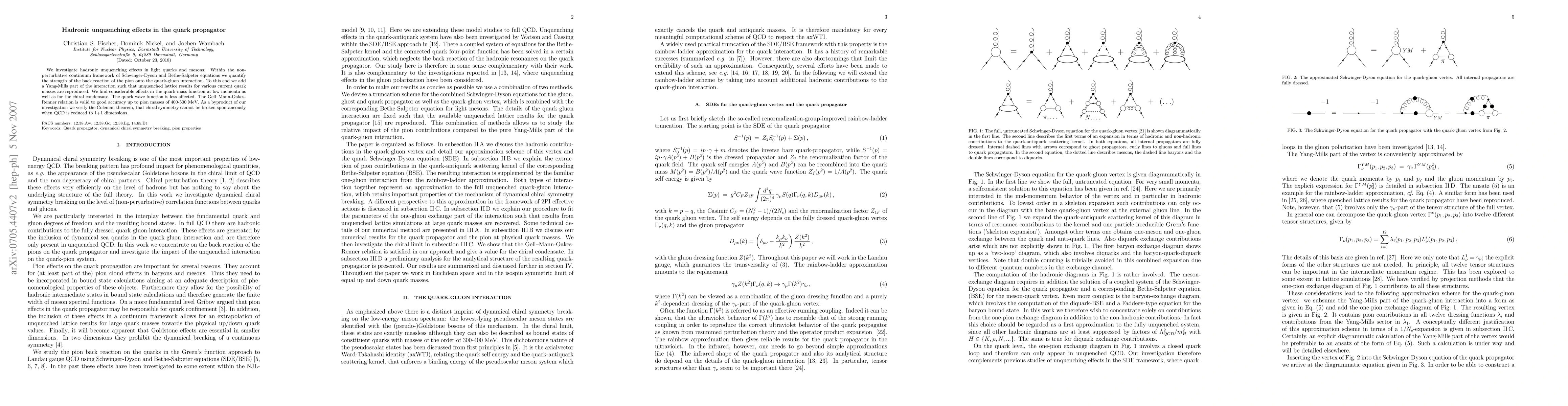 We investigate hadronic unquenching effects in light quarks and mesons. Within the non-perturbative continuum framework of Schwinger-Dyson and Bethe-Salpeter equations we quantify the strength of the back reaction of the pion onto the quark-gluon interaction. To this end we add a Yang-Mills part of the interaction such that unquenched lattice results for various current quark masses are reproduced. We find considerable effects in the quark mass function at low momenta as well as for the chiral condensate. The quark wave function is less affected. The Gell--Mann-Oakes-Renner relation is valid to good accuracy up to pion masses of 400-500 MeV. As a byproduct of our investigation we verify the Coleman theorem, that chiral symmetry cannot be broken spontaneously when QCD is reduced to 1+1 dimensions.