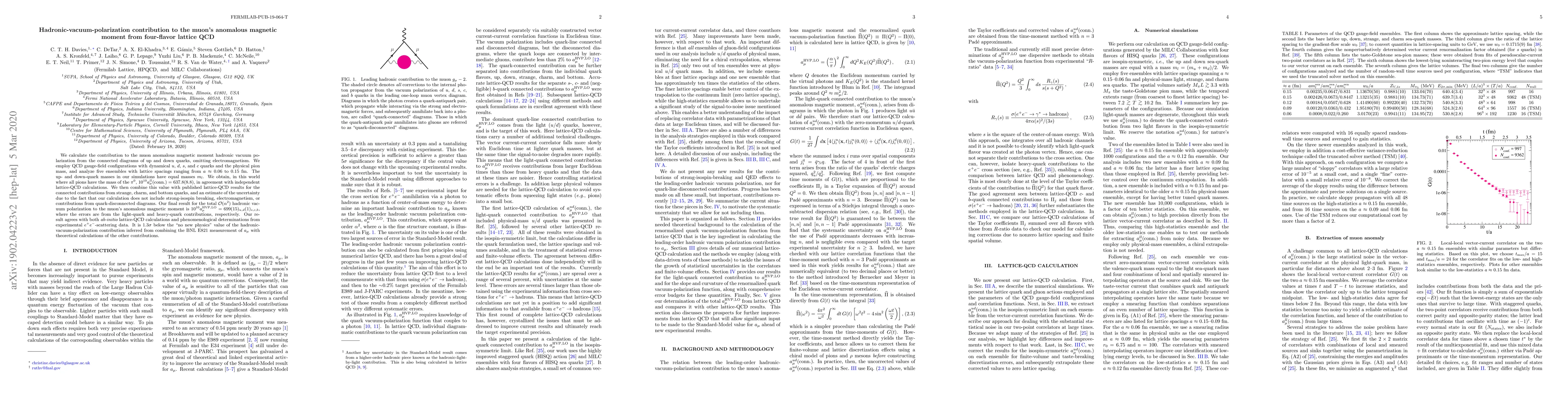 This paper calculates the hadronic vacuum polarization contribution to the muon's anomalous magnetic moment from four-flavor lattice QCD, focusing on connected diagrams of up and down quarks. The result, $10^{10}a_\mu^{\rm HVP,LO} = 699(15)$, agrees with independent lattice-QCD calculations and experimental data, though it is slightly below the "no new physics" value inferred from other measurements.