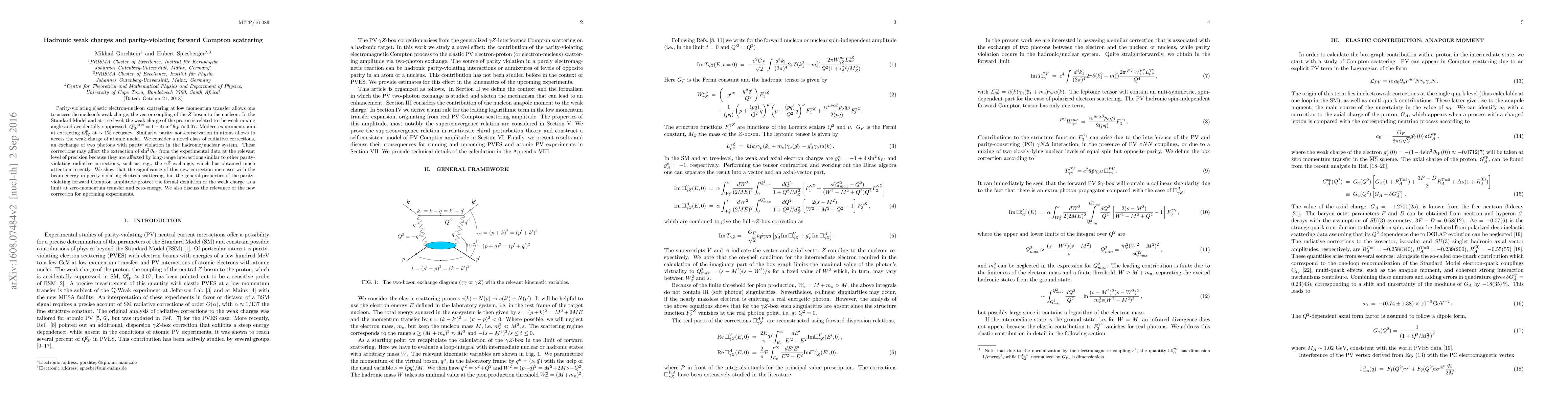 Parity-violating elastic electron-nucleon scattering at low momentum transfer allows one to access the nucleon's weak charge, the vector coupling of the $Z$-boson to the nucleon. In the Standard Model and at tree level, the weak charge of the proton is related to the weak mixing angle and accidentally suppressed, $Q_W^{p,\,{\rm tree}}=1-4\sin^2\theta_W\approx0.07$. Modern experiments aim at extracting $Q_W^p$ at $\sim1\%$ accuracy. Similarly, parity non-conservation in atoms allows to access the weak charge of atomic nuclei. We consider a novel class of radiative corrections, an exchange of two photons with parity violation in the hadronic/nuclear system. These corrections may affect the extraction of $\sin^2\theta_W$ from the experimental data at the relevant level of precision because they are affected by long-range interactions similar to other parity-violating radiative corrections, such as, e.g., the $\gamma Z$-exchange, which has obtained much attention recently. We show that the significance of this new correction increases with the beam energy in parity-violating electron scattering, but the general properties of the parity-violating forward Compton amplitude protect the formal definition of the weak charge as a limit at zero-momentum transfer and zero-energy. We also discuss the relevance of the new correction for upcoming experiments.