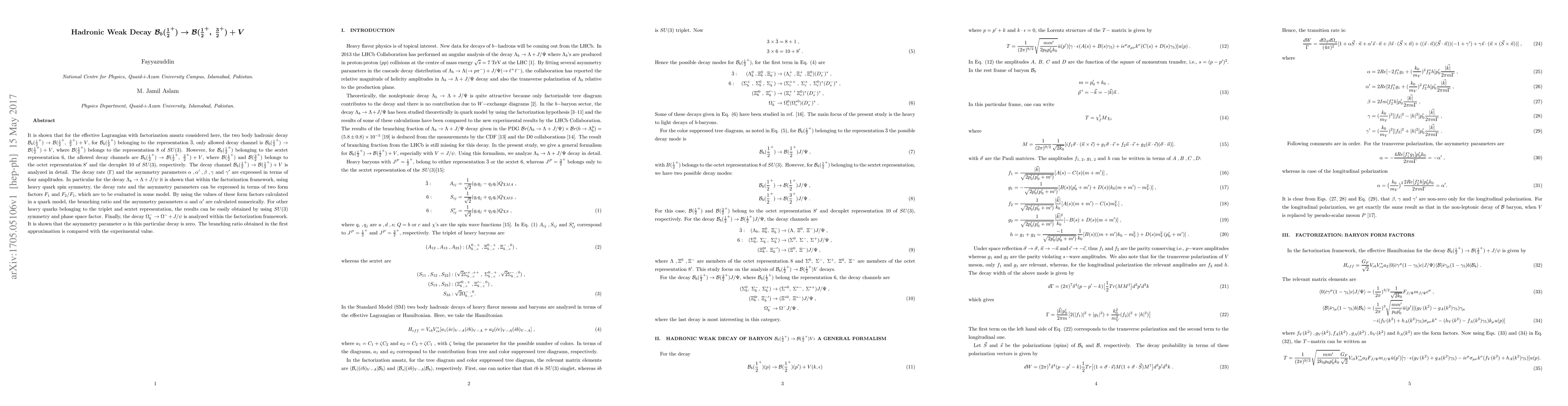 It is shown that for the effective Lagrangian with factorization ansatz considered here, the two body hadronic decay $\mathcal{B}_{b}(\frac{1}{2}^+) \to \mathcal{B}(\frac{1}{2}^{+},\; \frac{3}{2}^{+}) + V$, for $\mathcal{B}_{b}(\frac{1}{2}^{+})$ belonging to the representation $\bar{3}$, only allowed decay channel is $\mathcal{B}_{b}(\frac{1}{2}^+) \to \mathcal{B}(\frac{1}{2}^{+})+ V$, where $\mathcal{B}(\frac{1}{2}^{+})$ belongs to the representation $8$ of $SU(3)$. However, for $\mathcal{B}_{b}(\frac{1}{2}^{+})$ belonging to the sextet representation $6$, the allowed decay channels are $\mathcal{B}_{b}(\frac{1}{2}^+) \to \mathcal{B}(\frac{1}{2}^{+},\; \frac{3}{2}^{+}) + V$, where $\mathcal{B}(\frac{1}{2}^{+})$ and $\mathcal{B}(\frac{3}{2}^{+})$ belongs to the octet representation $8^{\prime}$ and the decuplet $10$ of $SU(3)$, respectively. The decay channel $\mathcal{B}_{b}(\frac{1}{2}^+) \to \mathcal{B}(\frac{1}{2}^{+}) + V$ is analyzed in detail. The decay rate ($\Gamma$) and the asymmetry parameters $\alpha\;, \alpha^{\prime}\;, \beta\;, \gamma$ and $\gamma^{\prime}$ are expressed in terms of four amplitudes. In particular for the decay $\Lambda_b \to \Lambda + J/\psi$ it is shown that within the factorization framework, using heavy quark spin symmetry, the decay rate and the asymmetry parameters can be expressed in terms of two form factors $F_1$ and $F_{2}/F_{1}$, which are to be evaluated in some model. For other heavy quarks belonging to the triplet and sextet representation, the results can be easily obtained by using $SU(3)$ symmetry and phase space factor. Finally, the decay $\Omega_{b}^{-} \to \Omega^{-} + J/\psi$ is analyzed within the factorization framework. It is shown that the asymmetry parameter $\alpha$ in this particular decay is zero. The branching ratio obtained in the first approximation is compared with the experimental value.
