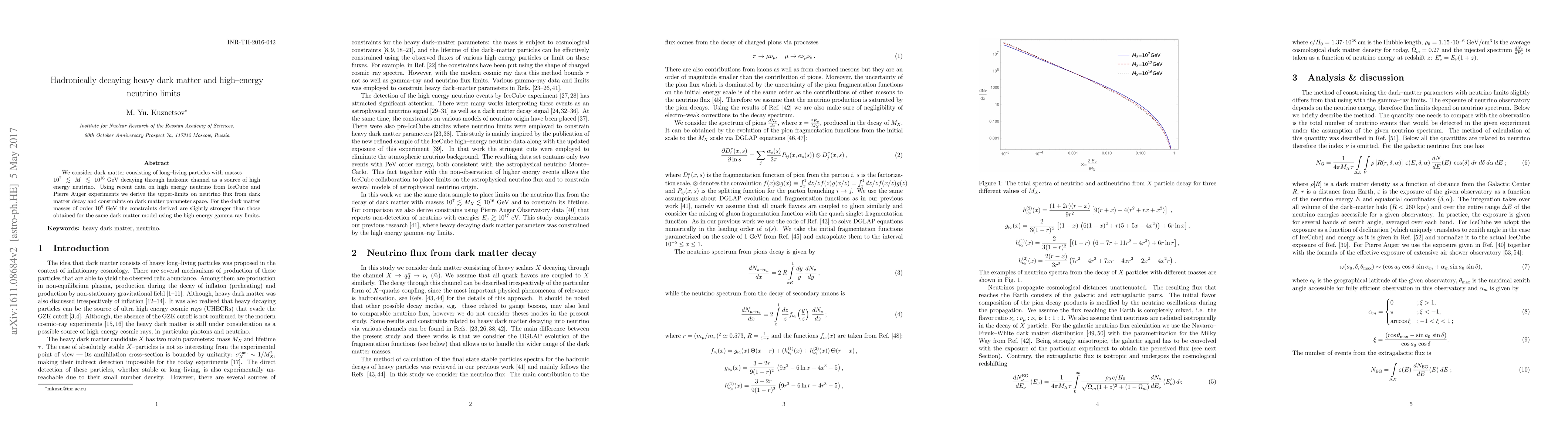 This paper investigates long-living, hadronically decaying heavy dark matter particles in the mass range of $10^{7}-10^{16}$ GeV as a source of high-energy neutrinos. It derives upper limits on neutrino flux from IceCube and Pierre Auger data, finding stronger constraints for $10^8$ GeV dark matter than those from high-energy gamma-ray limits.