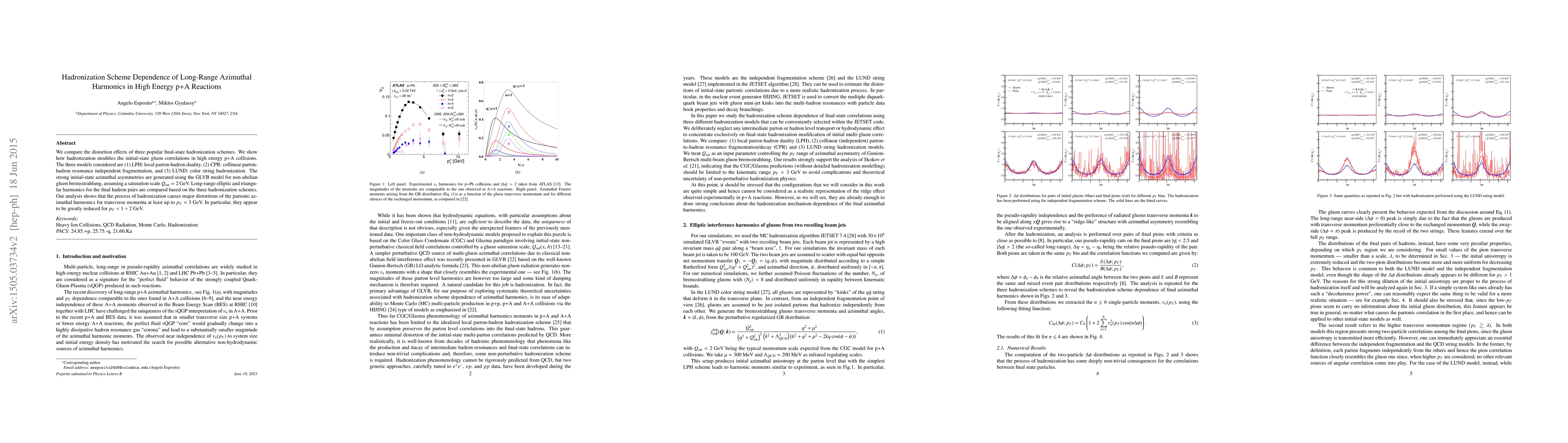 We compare the distortion effects of three popular final-state hadronization schemes. We show how hadronization modifies the initial-state gluon correlations in high energy p+A collisions. The three models considered are (1) LPH: local parton-hadron duality, (2) CPR: collinear parton- hadron resonance independent fragmentation, and (3) LUND: color string hadronization. The strong initial-state azimuthal asymmetries are generated using the GLVB model for non-abelian gluon bremsstrahlung, assuming a saturation scale Qsat = 2 GeV. Long-range elliptic and triangular harmonics for the final hadron pairs are compared based on the three hadronization schemes. Our analysis shows that the process of hadronization causes major distortions of the partonic azimuthal harmonics for transverse momenta at least up to pT = 3GeV. In particular, they appear to be greatly reduced for pT < 1{\div}2GeV.