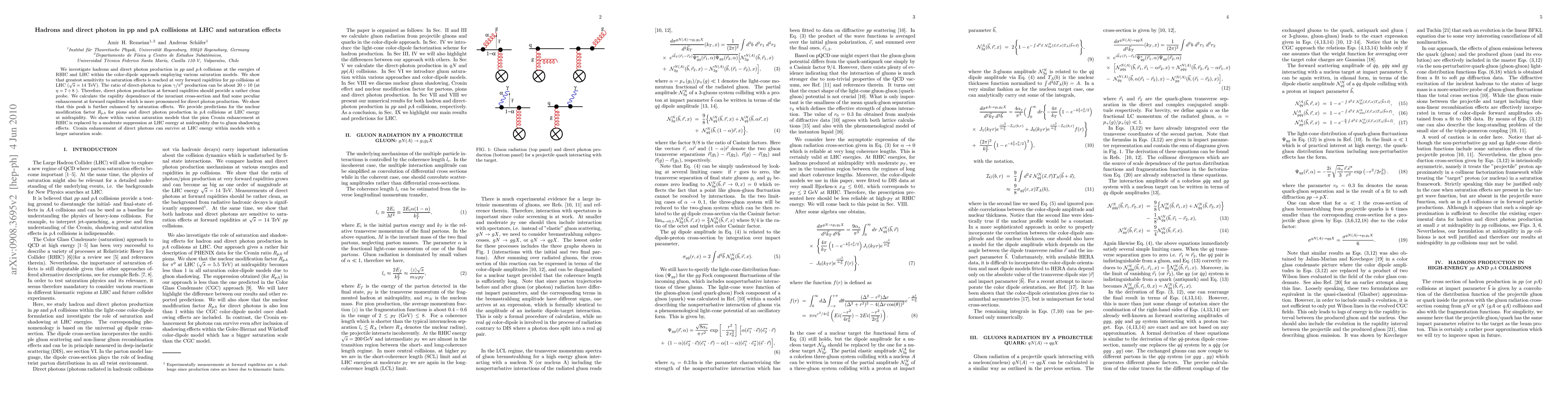We investigate hadrons and direct photon production in pp and pA collisions at the energies of RHIC and LHC within the color-dipole approach employing various saturation models. We show that greatest sensitivity to saturation effects is reached at very forward rapidities for pp collisions at LHC (\sqrt{s}=14 TeV). The ratio of direct-photon to pion production can be about 20-10 (at \eta=7-8). Therefore, direct photon production at forward rapidities should provide a rather clean probe. We calculate the rapidity dependence of the invariant cross-section and find some peculiar enhancement at forward rapidities which is more pronounced for direct photon production. We show that this peak is further enhanced by saturation effects. We provide predictions for the nuclear modification factor R_{pA} for pions and direct photon production in pA collisions at LHC energy at midrapidity. We show within various saturation models that the pion Cronin enhancement at RHIC is replaced by a moderate suppression at LHC energy at midrapidity due to gluon shadowing effects. Cronin enhancement of direct photons can survive at LHC energy within models with a larger saturation scale.