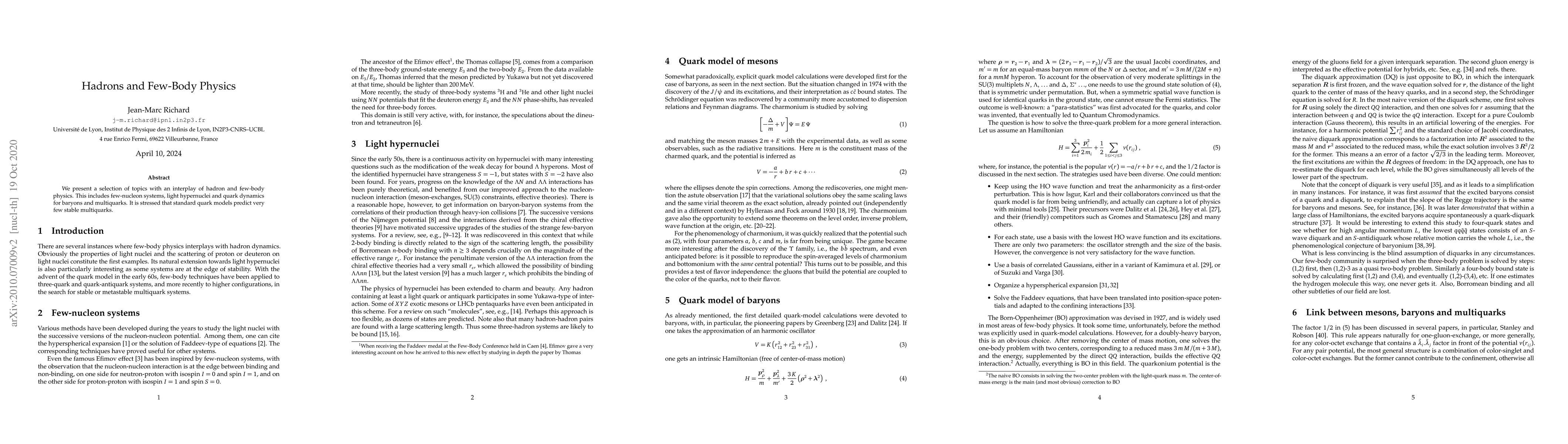 Summary: This paper explores the intersection of hadron and few-body physics, focusing on few-nucleon systems, light hypernuclei, and quark dynamics in baryons and multiquarks. It highlights that standard quark models suggest the existence of very few stable multiquarks.