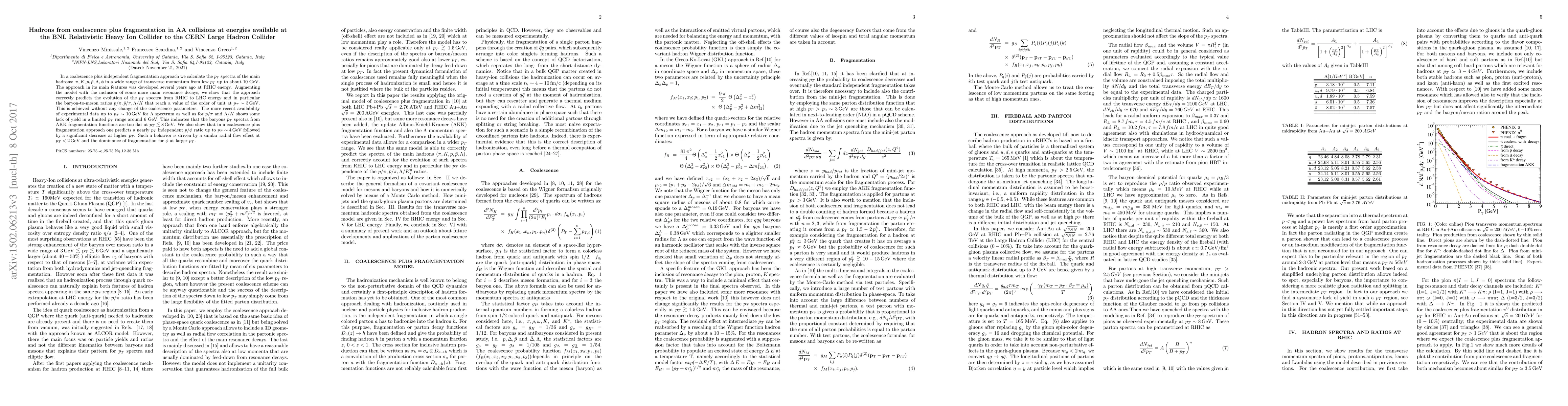 Researchers developed a model that predicts hadron spectra in AA collisions from RHIC to LHC energy, finding that baryons over mesons reach unity at 3 GeV and showing a nearly independent p_T ratio for p and phi up to 4 GeV.