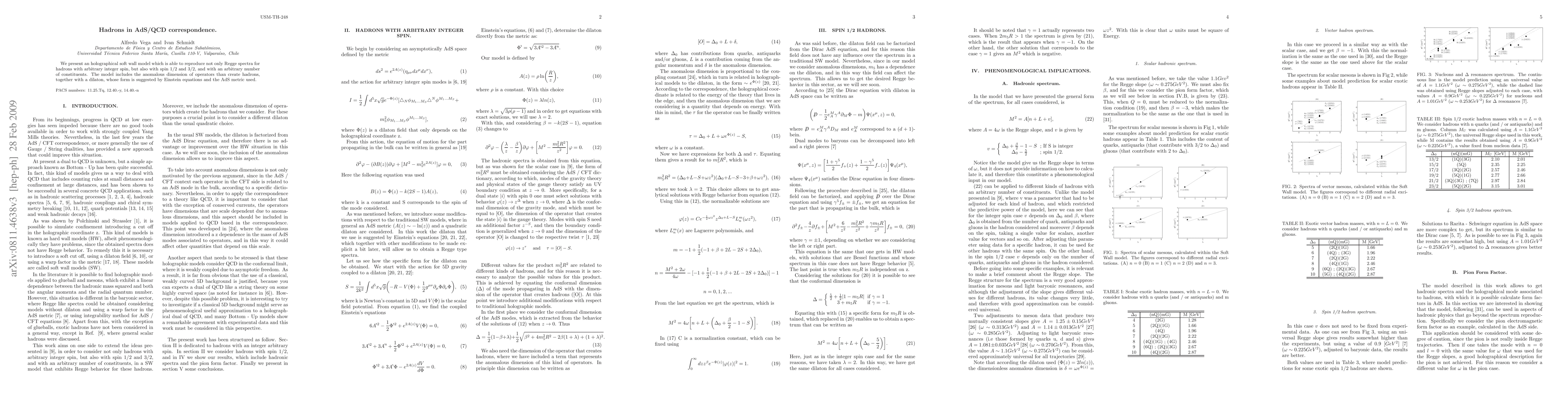We present an holographical soft wall model which is able to reproduce not only Regge spectra for hadrons with arbitrary integer spin, but also with spin 1/2 and 3/2, and with an arbitrary number of constituents. The model includes the anomalous dimension of operators than create hadrons, together with a dilaton, whose form is suggested by Einstein equations and the AdS metric.